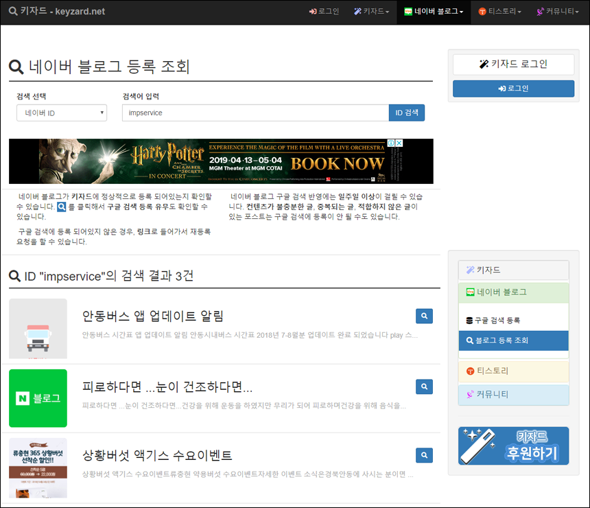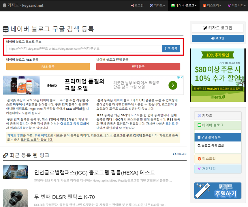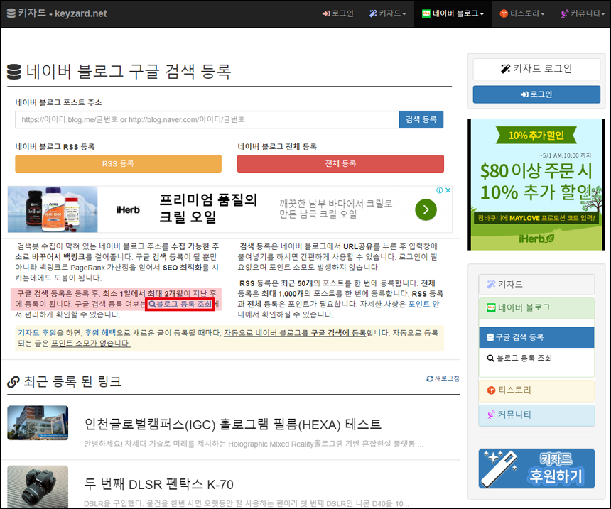 키자드 사이트 메인에서 [네이버 블로그 구글 검색 등록] 메뉴를 클릭