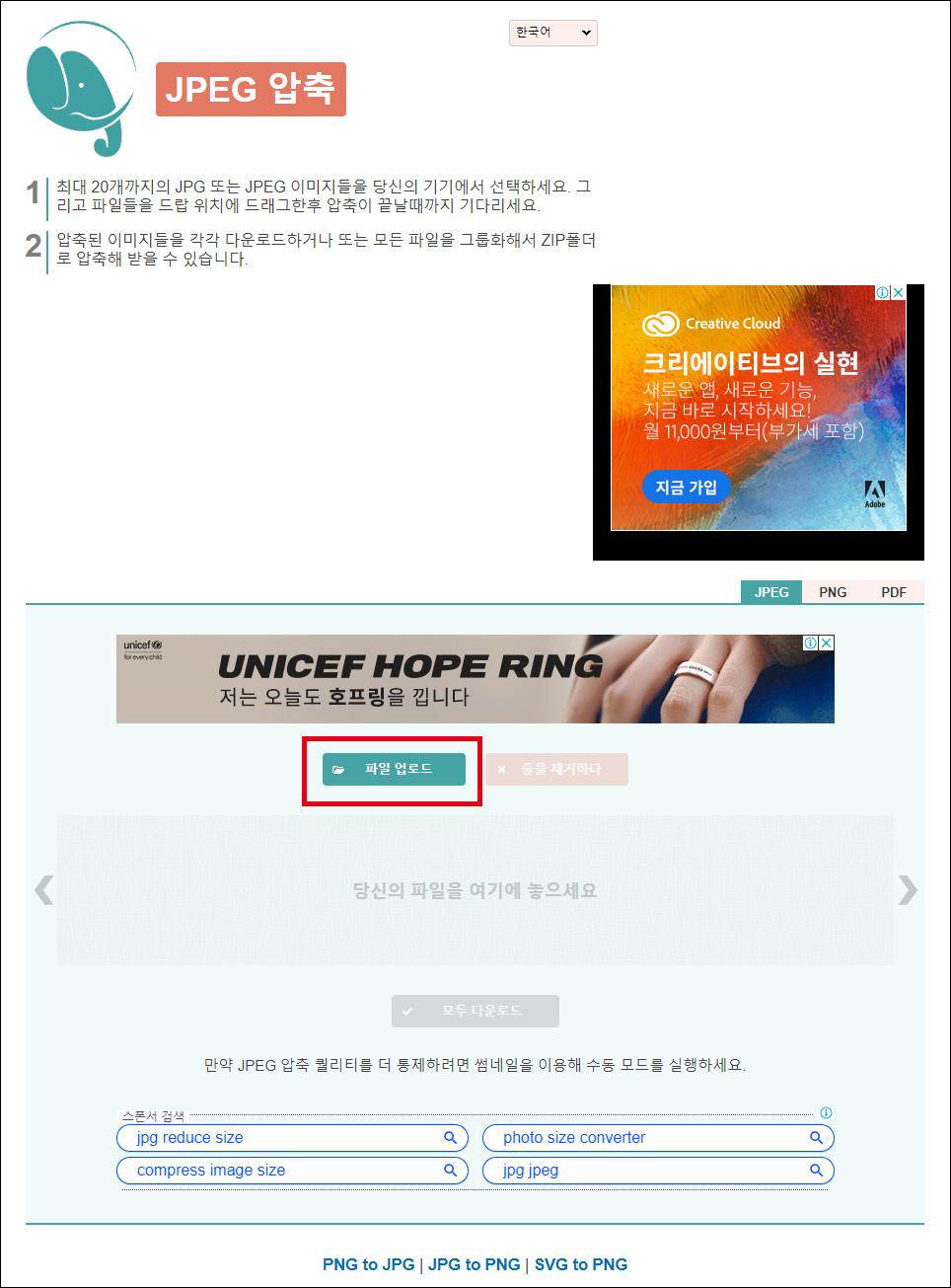 JPG이미지 뿐만 아니라 PNG, PDF 파일도 압축이 가능하다.