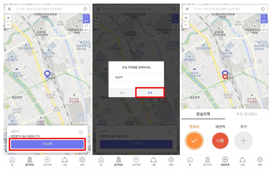 화면 하단의 관심지역을 누르면 추가한 장소의 공기 정보도 함께 확인할 수 있습니다.