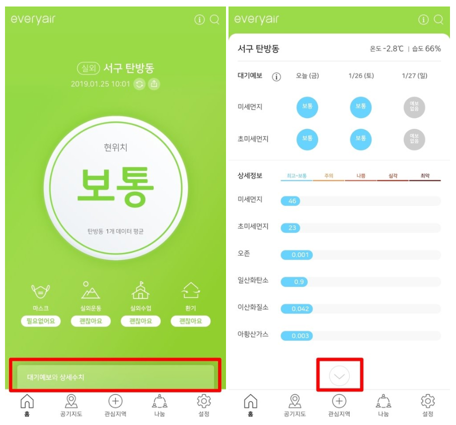 아래쪽 대기 예보와 상세 수치를 누르면 미세먼지 예보 상황과 공기질 관련 상세 수치를 확인할 수 있습니다.