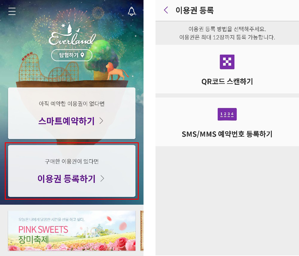 등록방법은 이용권 티켓의 QR코드를 찍어서