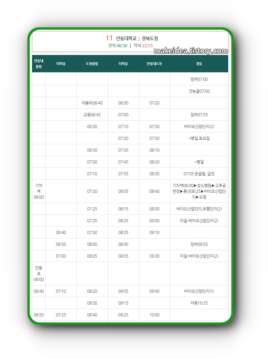 안동 시내버스 11번 책임 운송사인 안동버스에서 공지한 내용을 보면 3가지 평일과 토요일, 방학 때 평일과 토요일 그리고 일요일과 공휴일 운행으로 학기중과 방학 때 그리고 휴일에 운행되는 버스 시간이 일부 차이가 난다는 것이다.