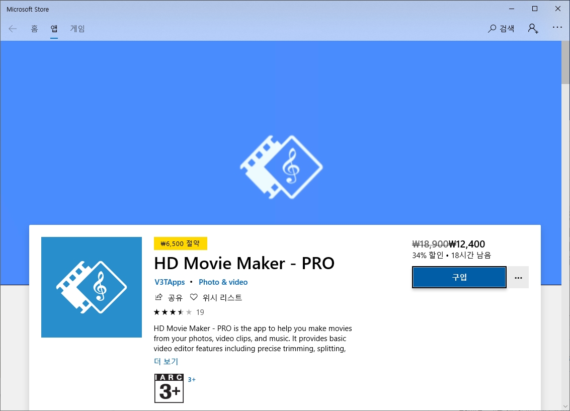 간단하게 사진 이어붙여 동영상 만들기나 동영상 변환 같은 간단한 기능만 필요하다면 윈도우 스토어에 들어가서 앱으로 무비메이커 무료 버전을 설치해 사용할 수 있다.