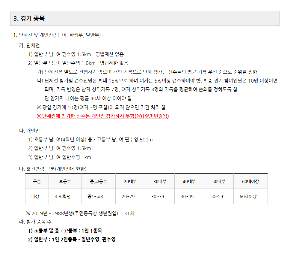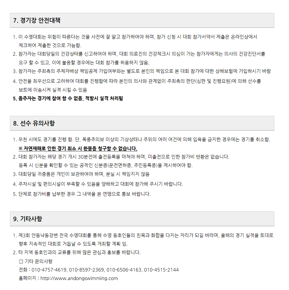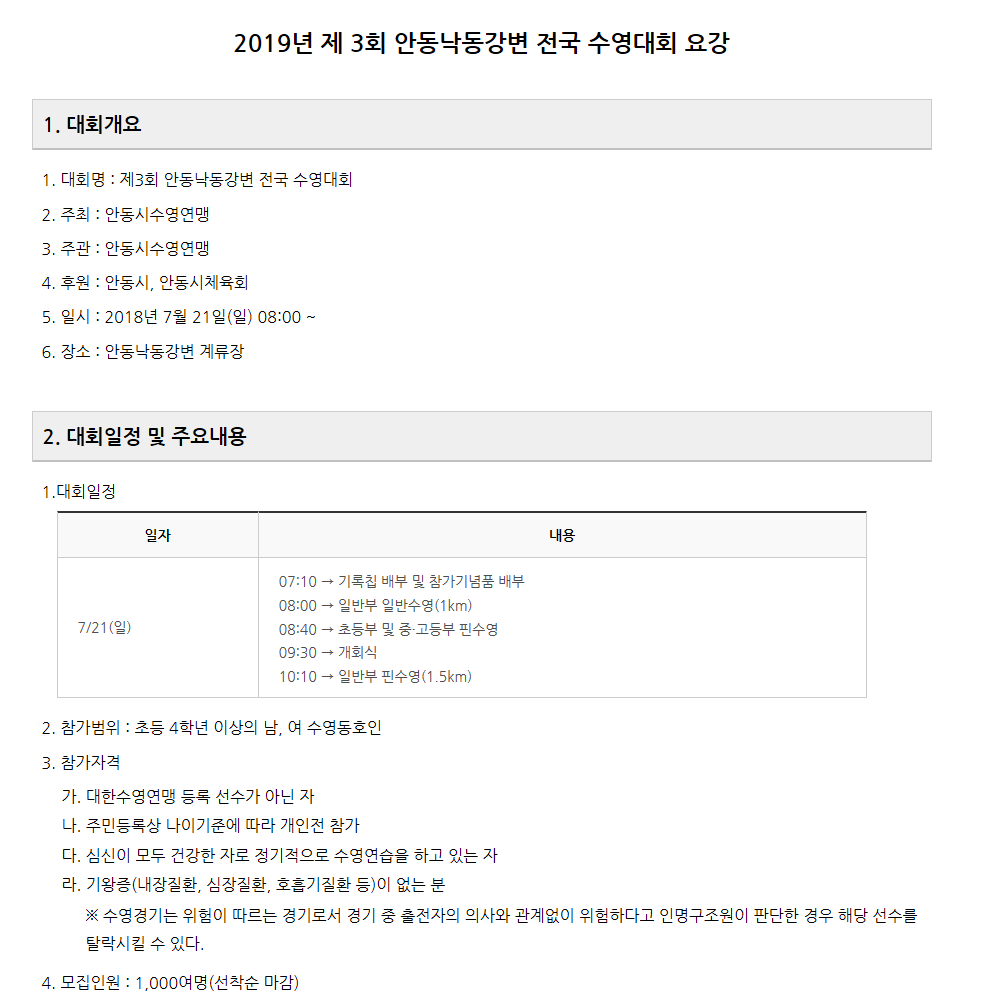 안동 낙동강변 전국 수영대회 요강