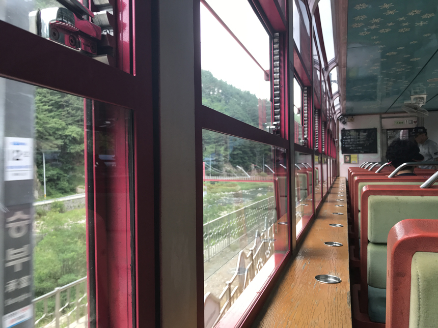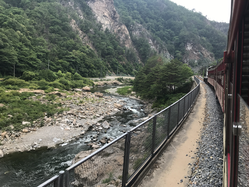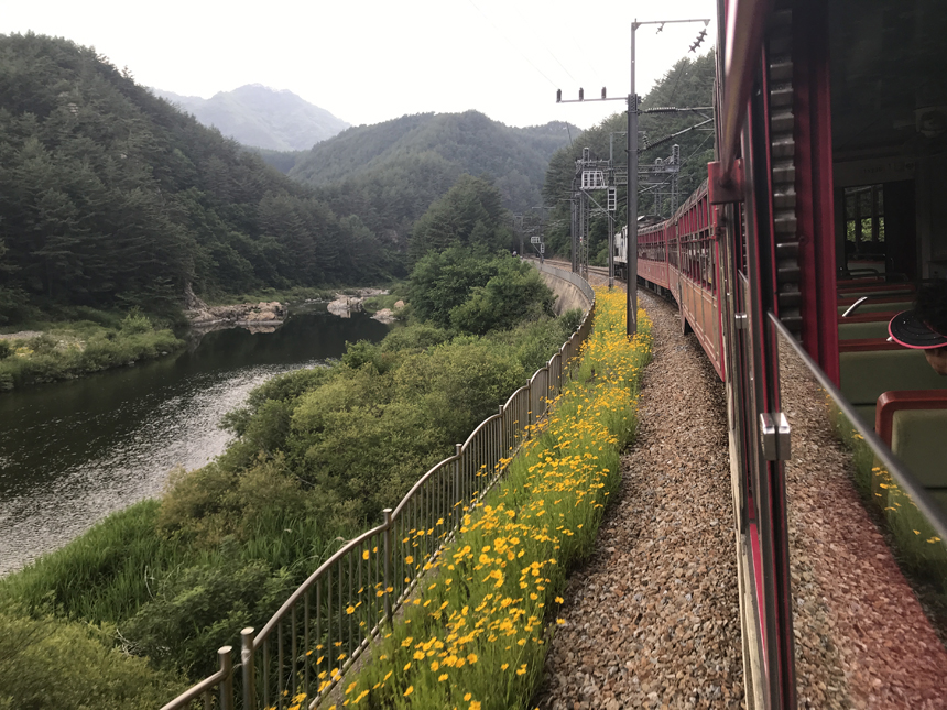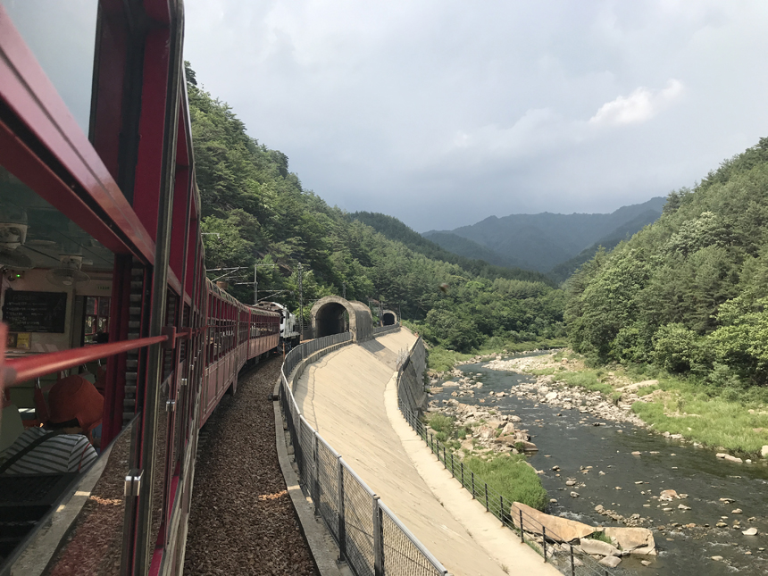 백두대간협곡열차의 맨 끝, 1호차에는 관람창이 있는데 이따금 협곡이나 계곡을 지날 때는 마치 4폭 병풍의 산수화를 보는 느낌도 든다.
