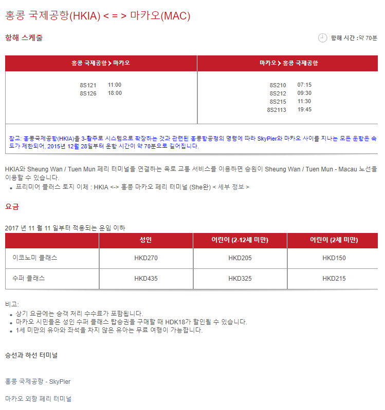 홍콩 국제공항(HKIA) < = > 마카오(MAC) 항해 스케줄 (약 70분) 홍콩 국제공항 마카오 마카오 홍콩 국제공항 8S121 11:00 8S126 18:00 8S210 07:15 8S212 09:30 8S215 11:30 8S2113 19:45 참고: 홍콩국제공항(HKIA)을 3-활주로 시스템으로 확장하는 것과 관련된 홍콩항공청의 명령에 따라 SkyPier와 마카오 사이를 지나는 모든 운항은 속도가 제한되어, 2015년 12월 28일부터 운항