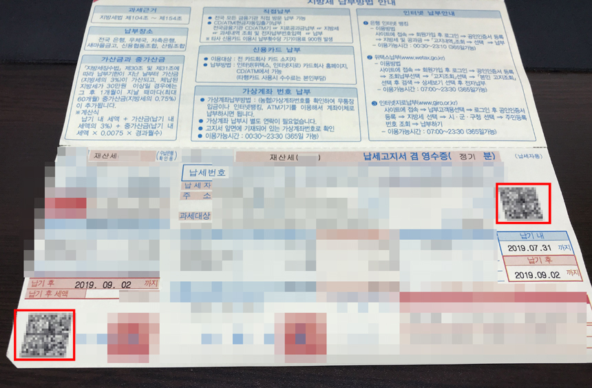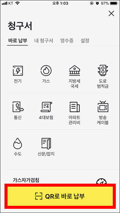 고지서의 지로 용지에 있는 QR코드를 화면에 갖다대면 알아서 인식한다.