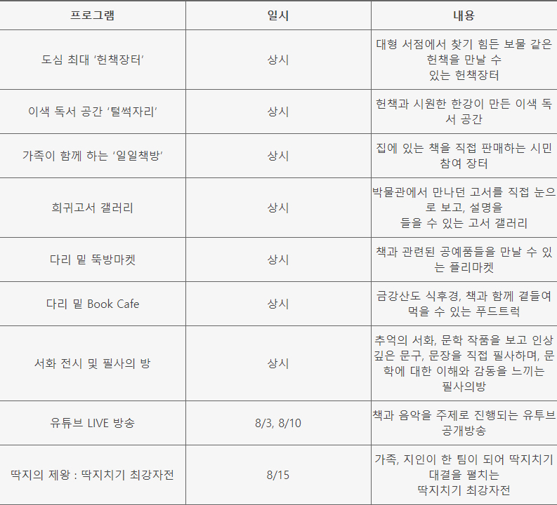 올해로 5회를 맞이하는 '2019 다리 밑 헌책방 축제'는 서울시에서 가장 큰 헌책 축제로, 헌책방뿐만 아니라 시민들이 직접 자신들의 헌책을 판매하는 일일 책방, 책과 함게하는 문화공연, 다양한 체험 프로그램, 푸드트럭 등 다채로운 프로그램들을 통해 올여름 도심 속 문화 휴양지로 거듭나고자 합니다.