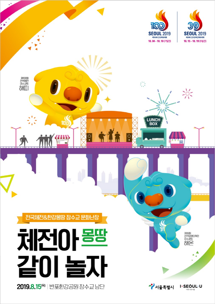 제100회 전국체전 D-50일, 2019.8.15.(목) 단 하루! 한강몽땅 여름축제와 연계한 ‘체전아, 몽땅 같이 놀자!’가 잠수교 위에서 거하게 펼쳐집니다.