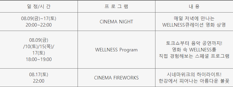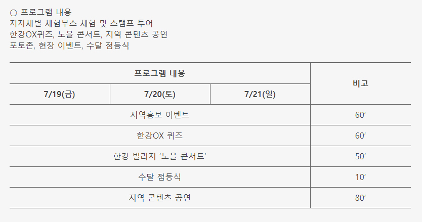 프로그램 : 한강의 숨은 명소에서 진행되는 휴식과 힐링형 프로그램(쉬터조성 맟 마사지, 요가, 명상 등)
