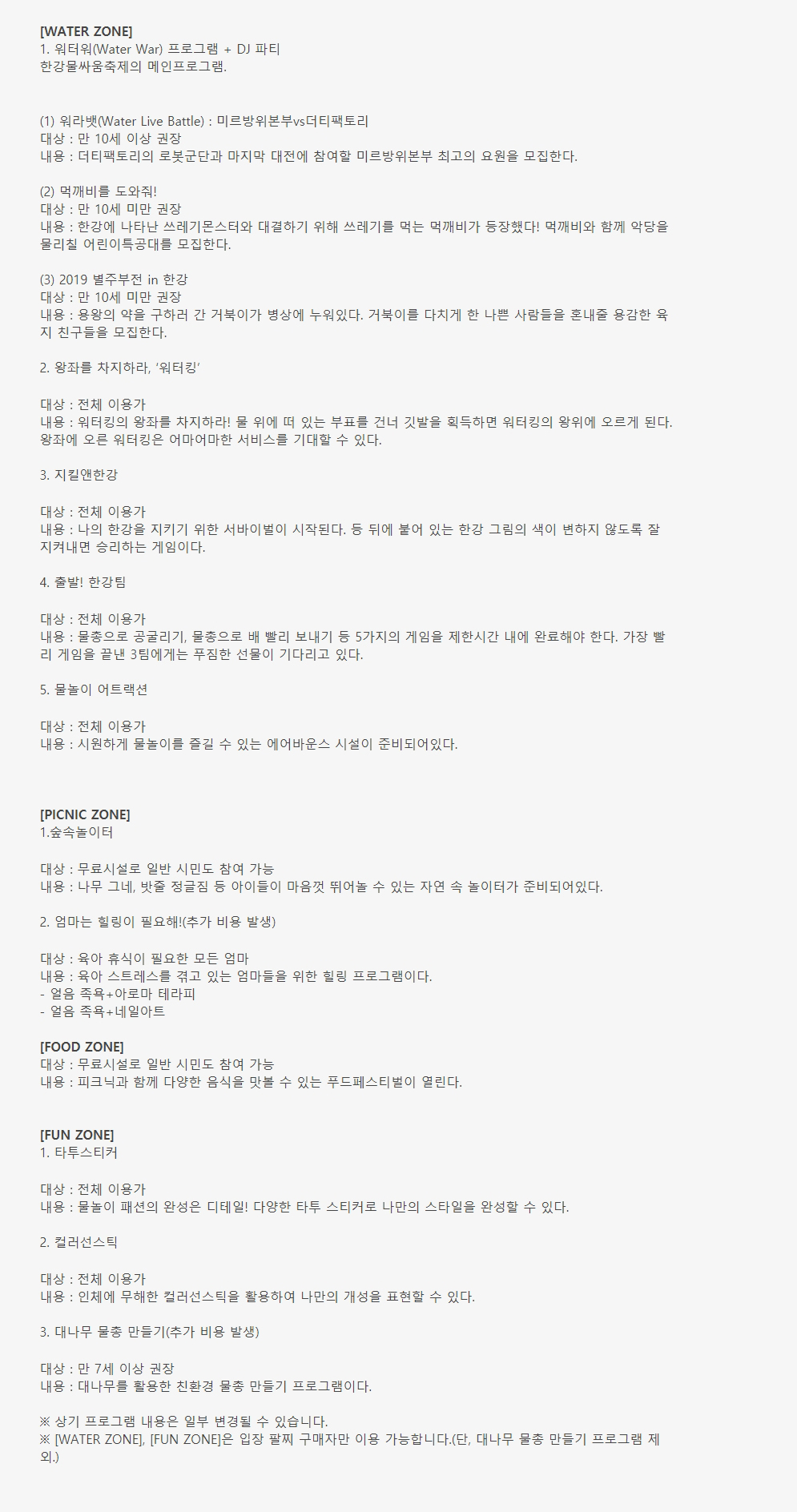 물놀이, 영화, 공연, 서커스, 생태체험,