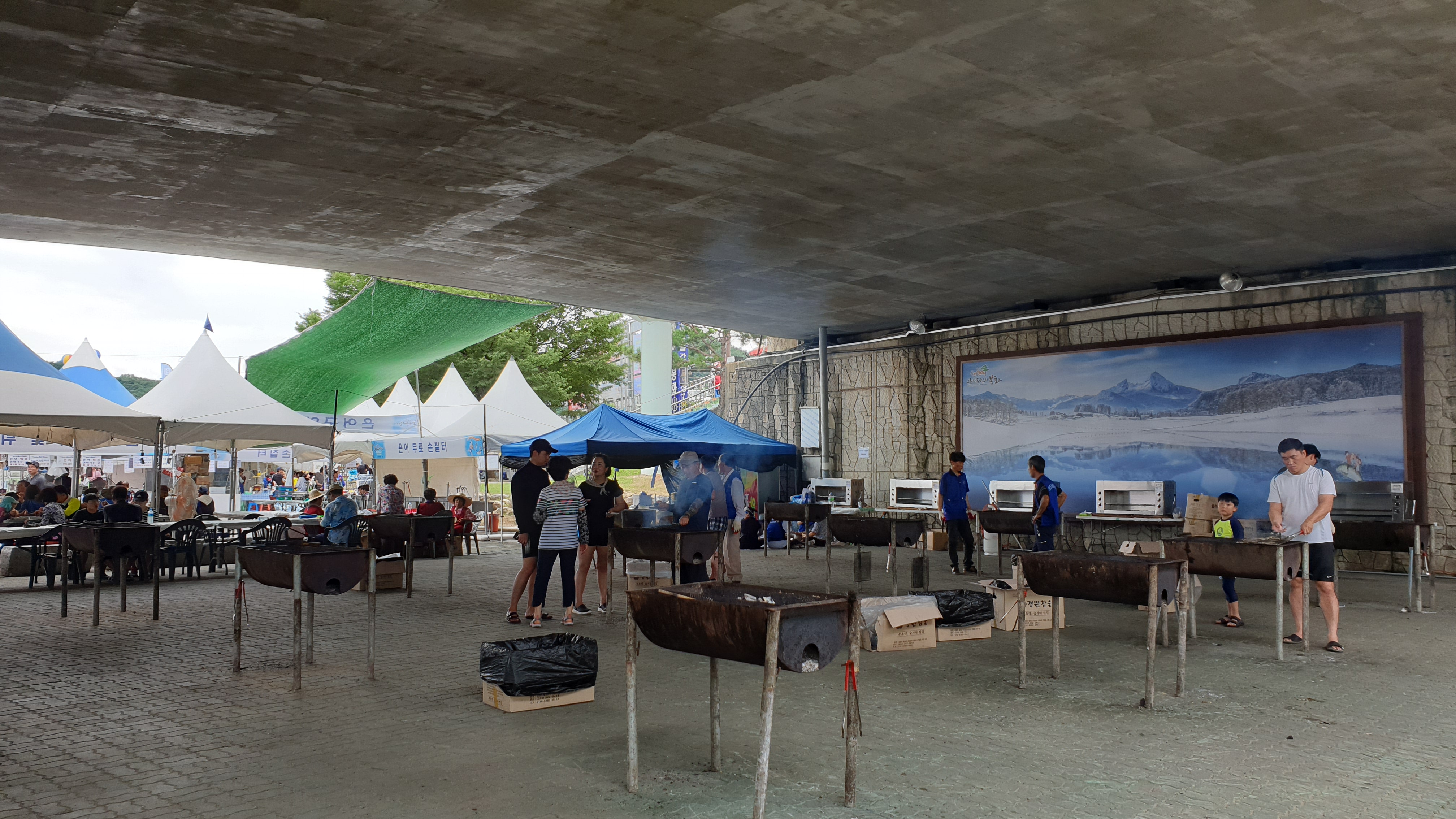 다리 밑 그늘, 은어구이터에서는 은어구이가 한창이다.