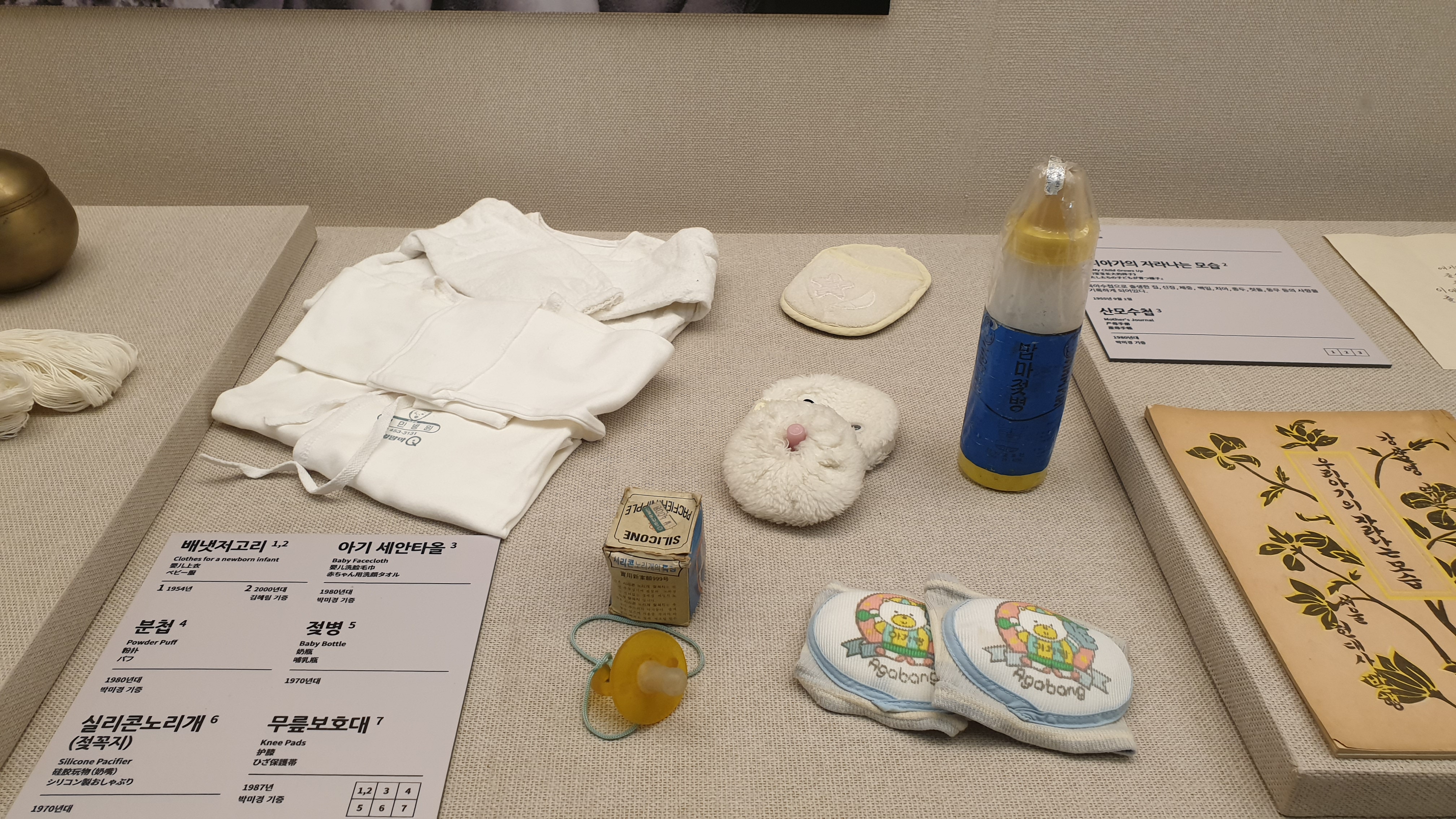 배넷저고리와 공갈젖꼭지, 젖병, 걸음마 때 넘어져도 다치지 말라고 채워주는 무릎보호대.