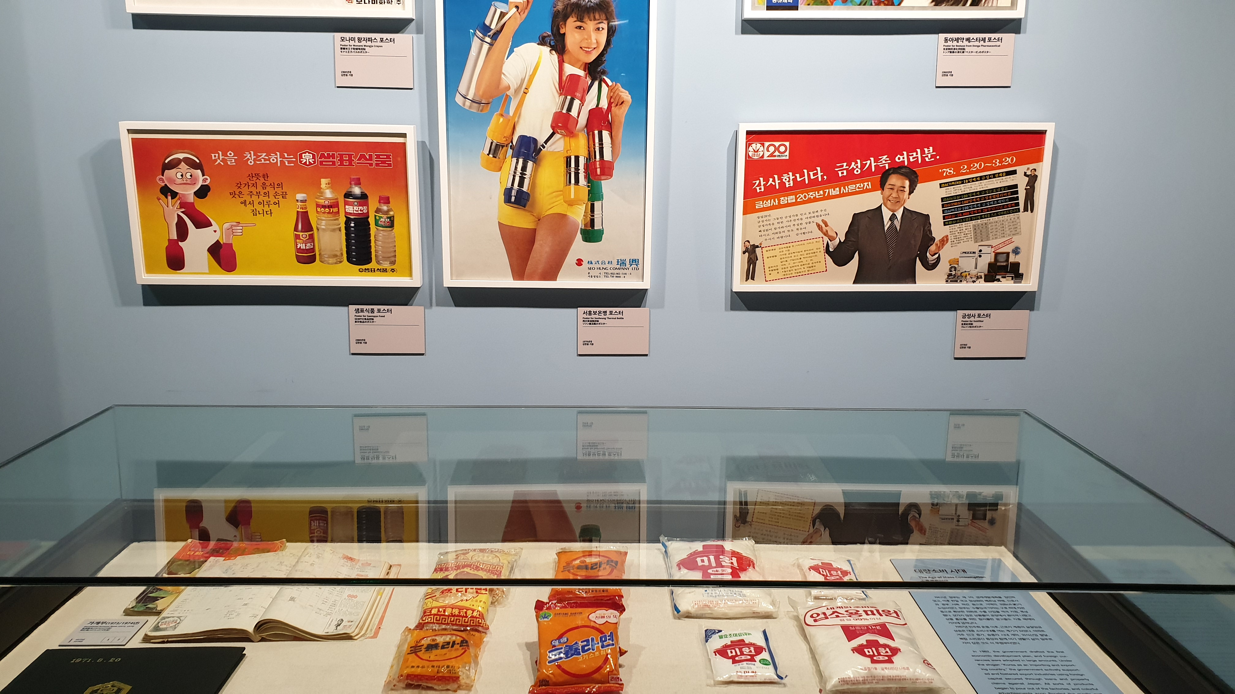 제품 광고 포스터가 전시되어 있다. 그 아래에는 삼양라면과 미원이 있다. 삼양라면도 그렇지만 미원도 포장디자인이 그 때나 지금이나 변함없이 한결 같네.