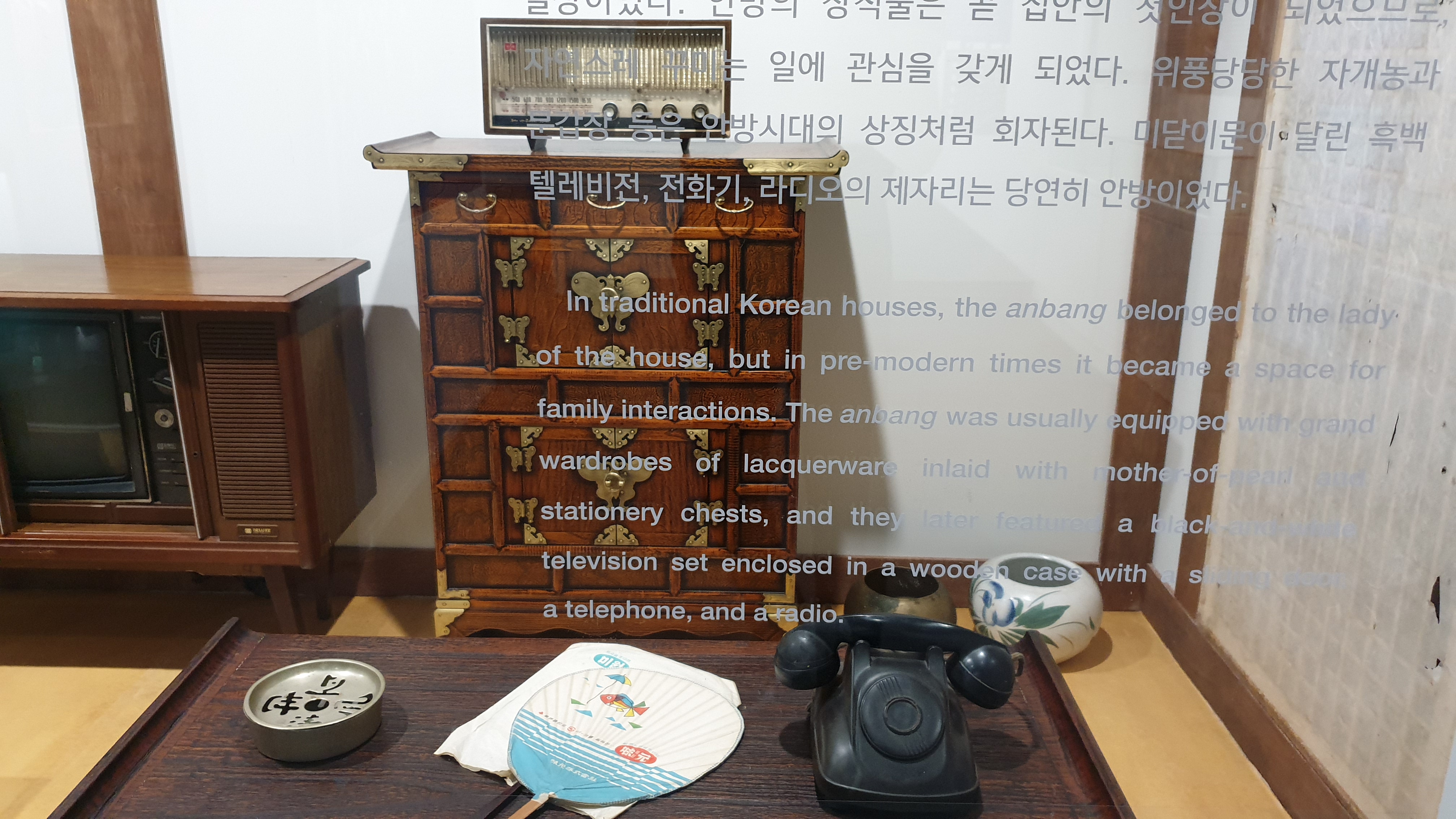 옆으로 밀어서 열고 닫는 미닫이문이 달린 텔레비전과 선풍기, 다이얼을 돌리는 전화기.