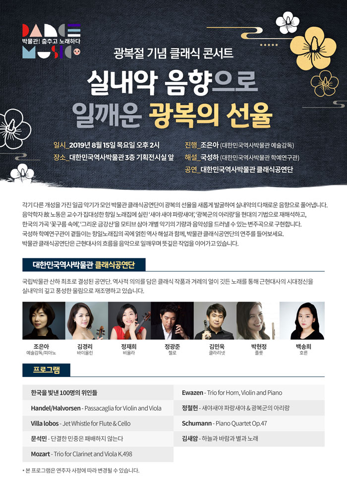 한편 광복절 당일인 8월 15일에는 대한민국역사박물관에서 <실내음악 음향으로 일깨운 광복의 선율> 콘서트도 열립니다. 이번 콘서트에서는 항일 노래집에 실린 '새야 새야 파랑새야', '광복군의 아리랑' 등을 현대 기법으로 재해석한 연주와 한국의 가곡 '꽃구름 속에', '그리운 금강산' 등을 모티브로 삼은 변주곡 무대를 진행할 예정이라고 합니다. 박물관 클래식 공연단의 연주와 함께 항일 노래집에 담긴 곡에 얽힌 역사 해설까지 들어볼 수 있는 뜻깊은 시간을 가져보세요.
