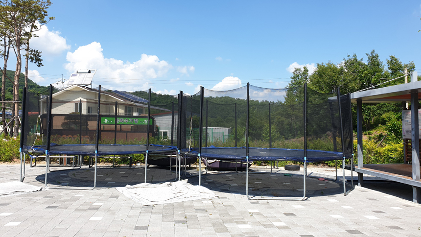 가족 동반 캠핑객을 위한 어린이 전용 트램폴린.
