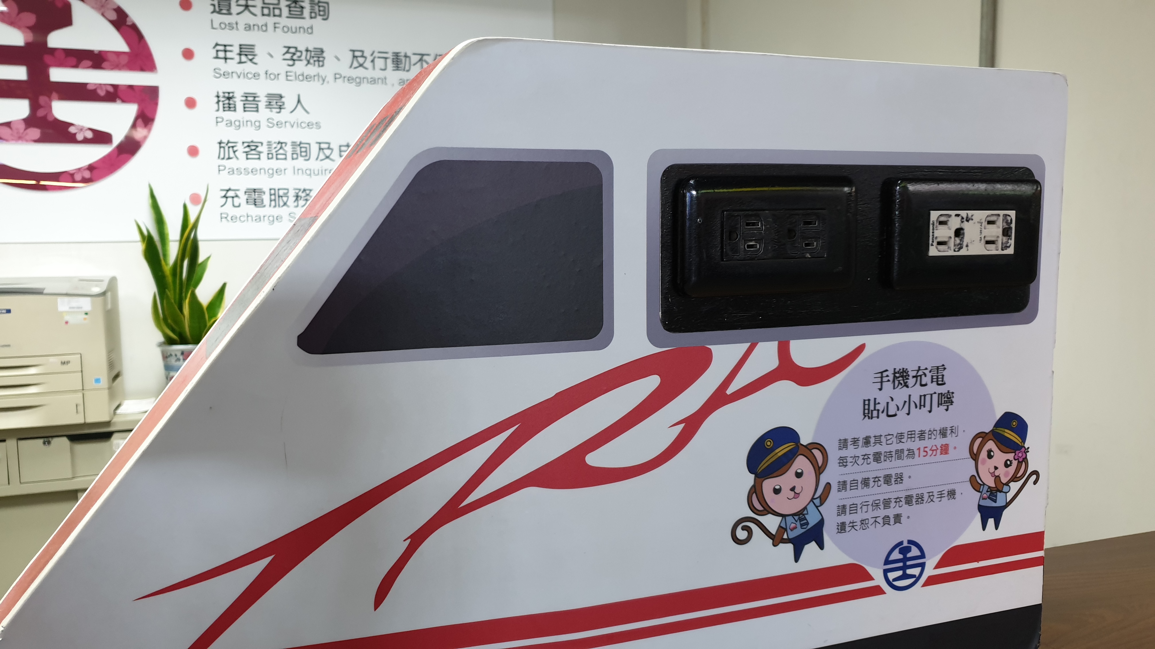 안내 데스크에 있는 전원 콘센트, 충전이 필요하다면 이곳을 이용하면 된다.