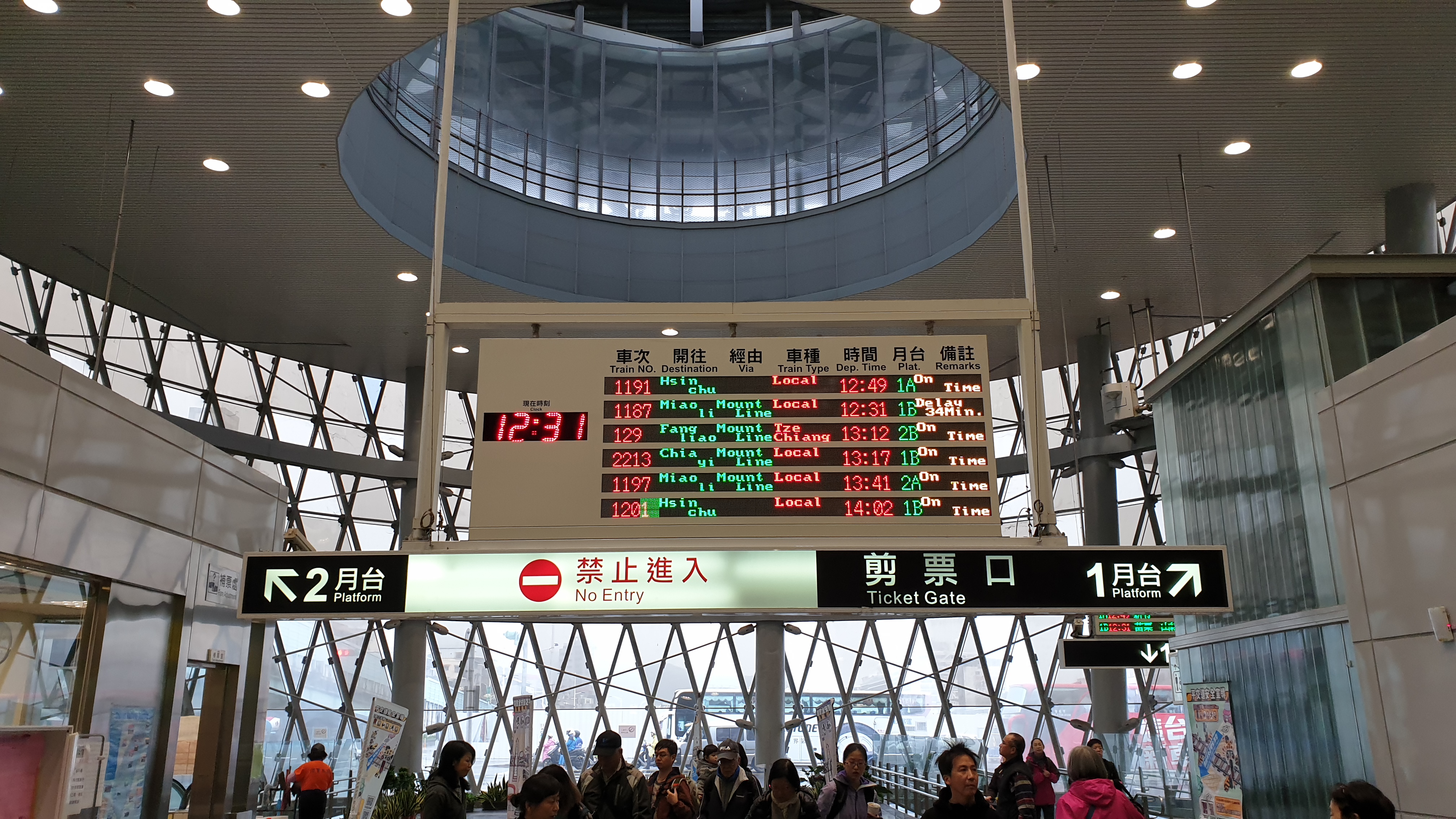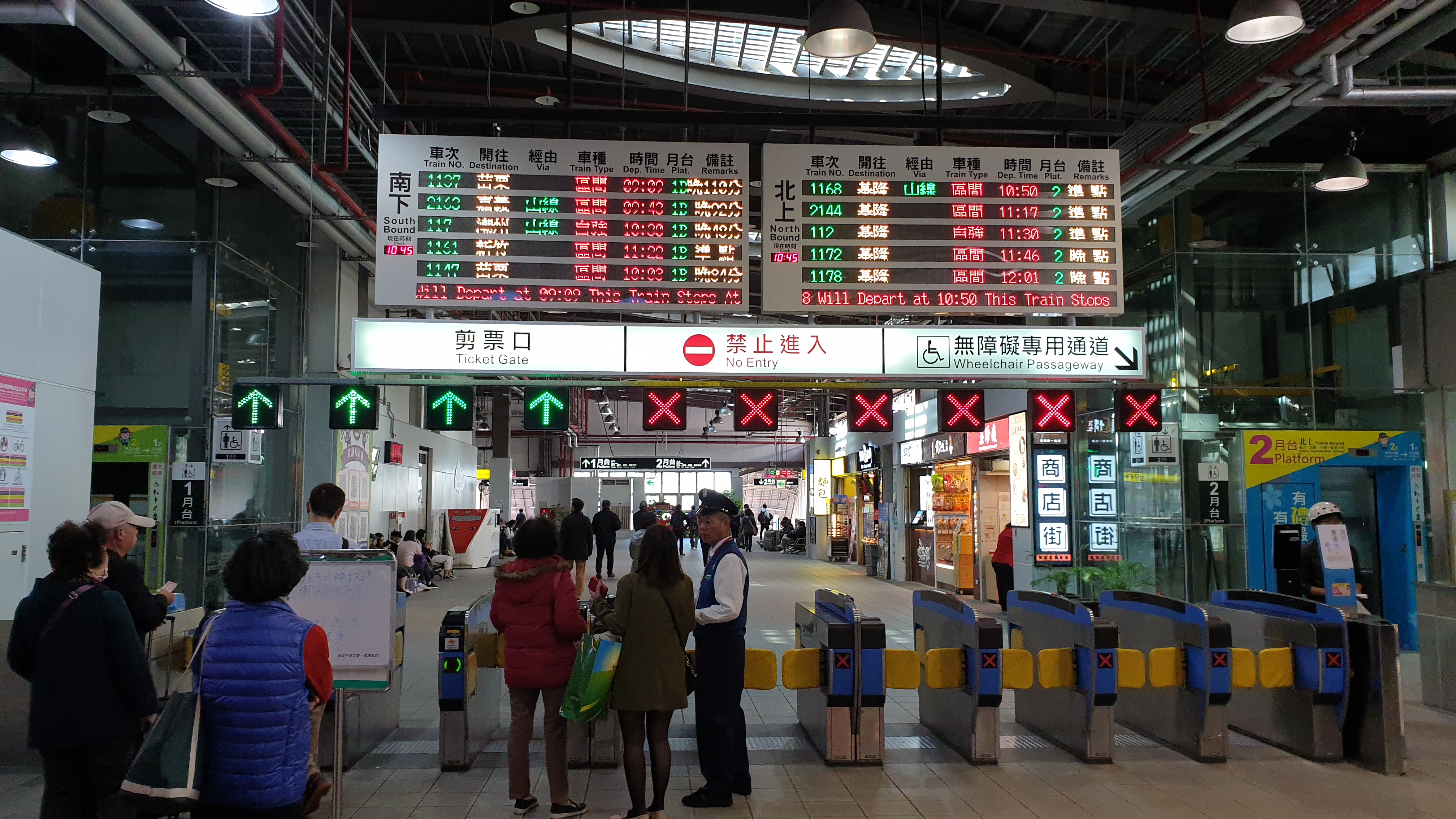 개찰구를 위에 있는 목적지 기차와 도착시간, 플랫폼을 확인해서 해당 플랫폼에서 기차를 기다리면 된다. 우리는 2번 플랫폼에서 10시 50분 지룽행 구간 기차를 탈 수 있었다. 1시간을 역에서 보내고 나서야.