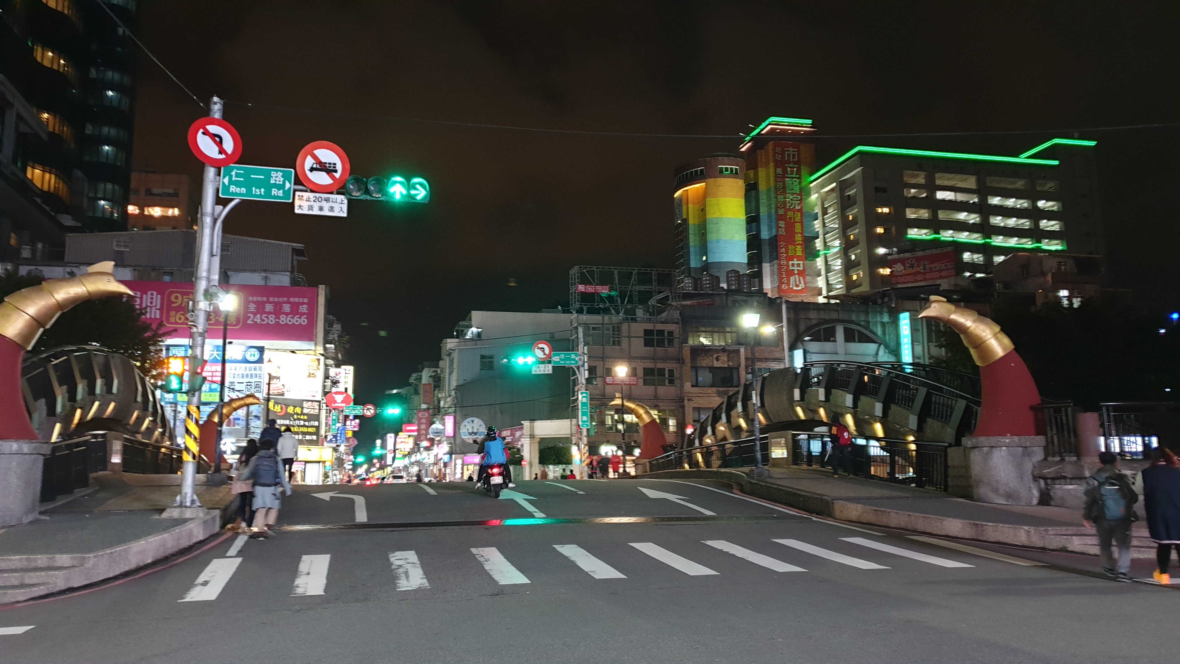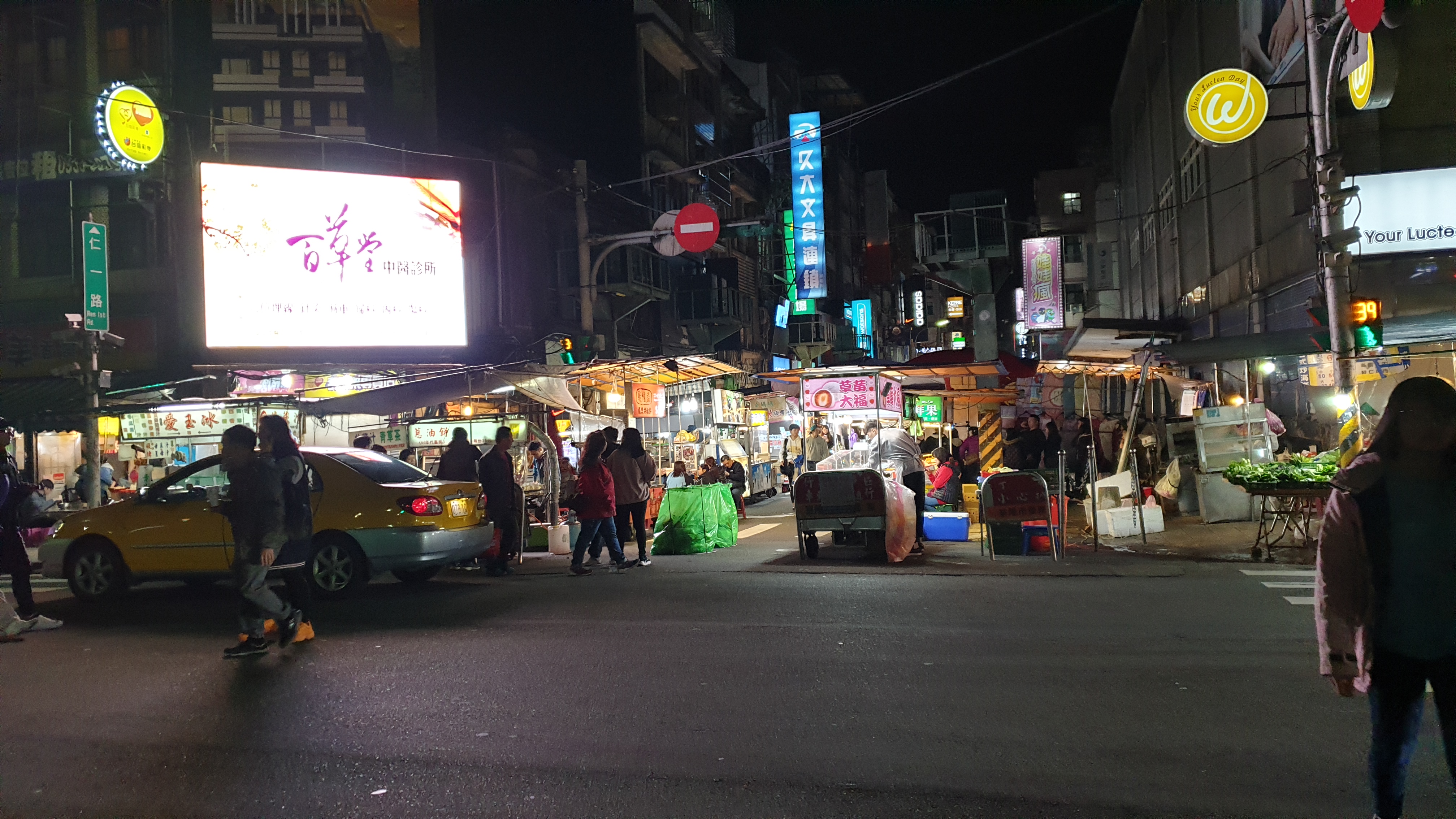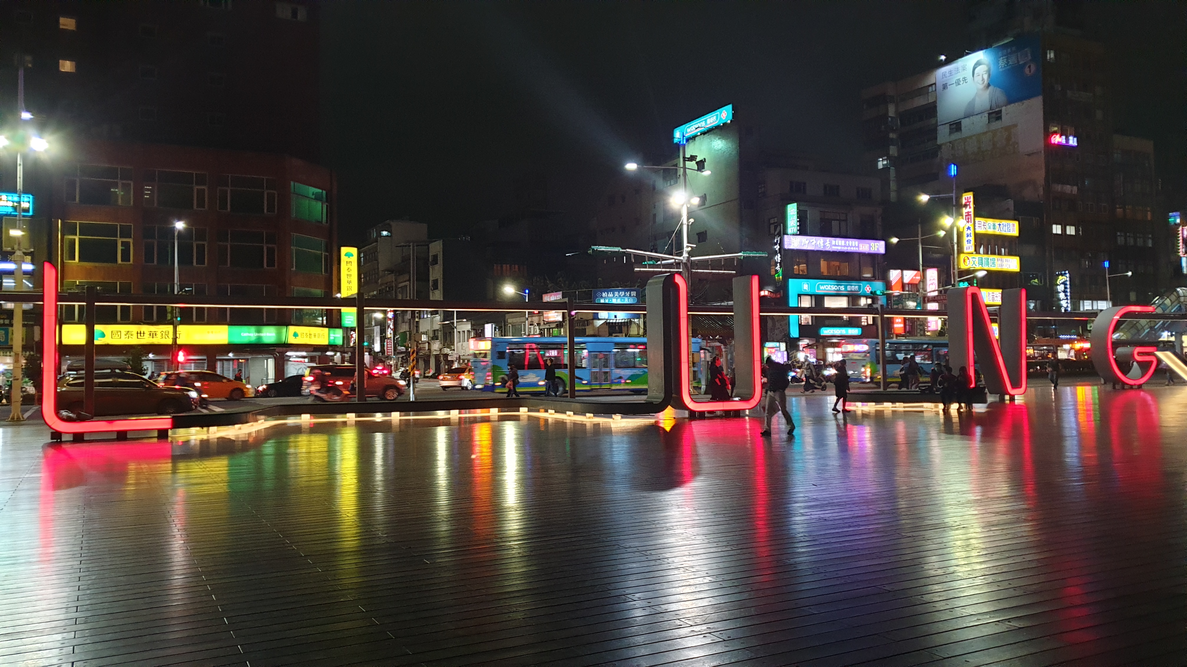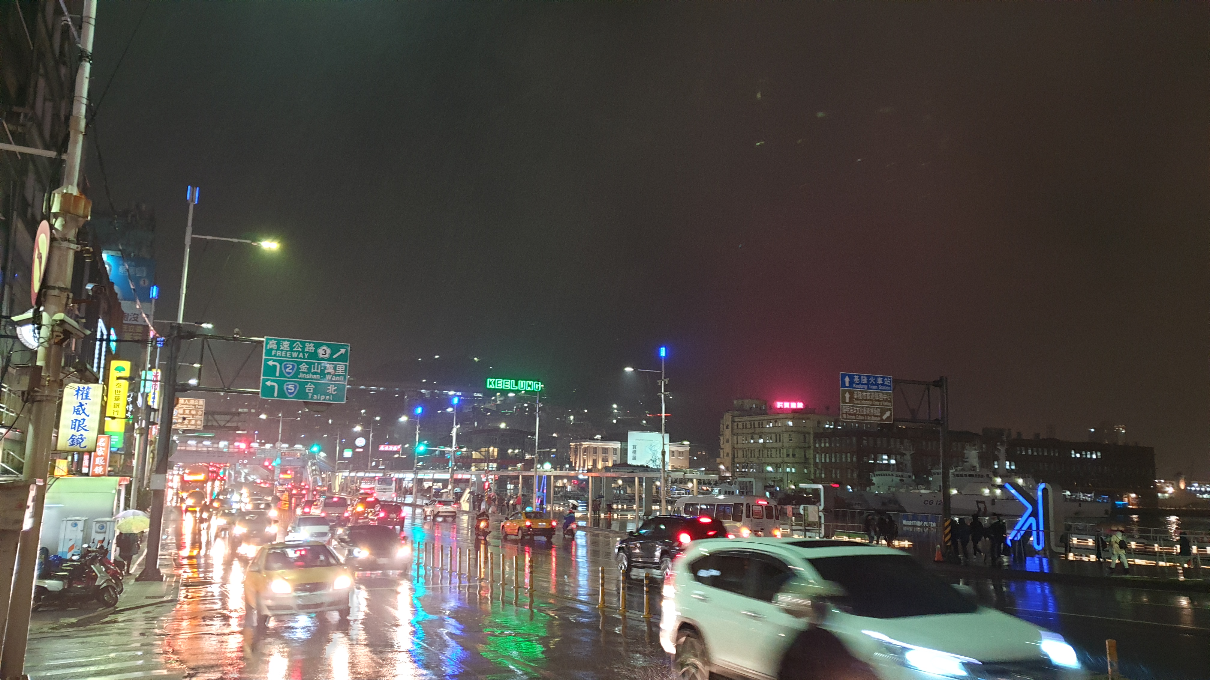 지룽의 밤거리, 저 멀리 조명이 들어온 간판이 보인다. 순차적으로 색이 이쁘게 변하고 있다.