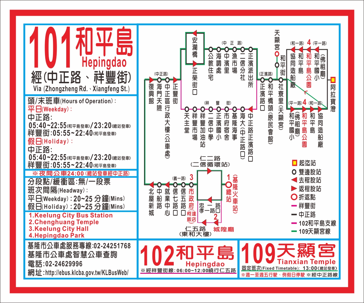 아래는 101번 버스 순환도이다. 1번 위치가 현재 위치이고 지룽 시청 앞을 거쳐 화평도까지 운행된다.
