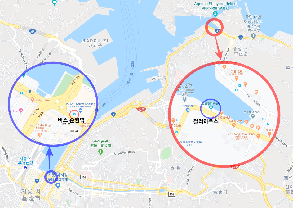 정빈항 컬러하우스는 지룽 버스 순환역에서 약 4.5km 거리에 있다.