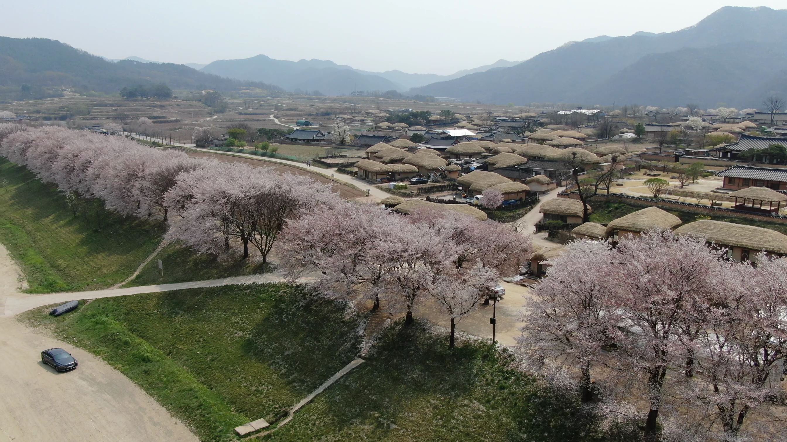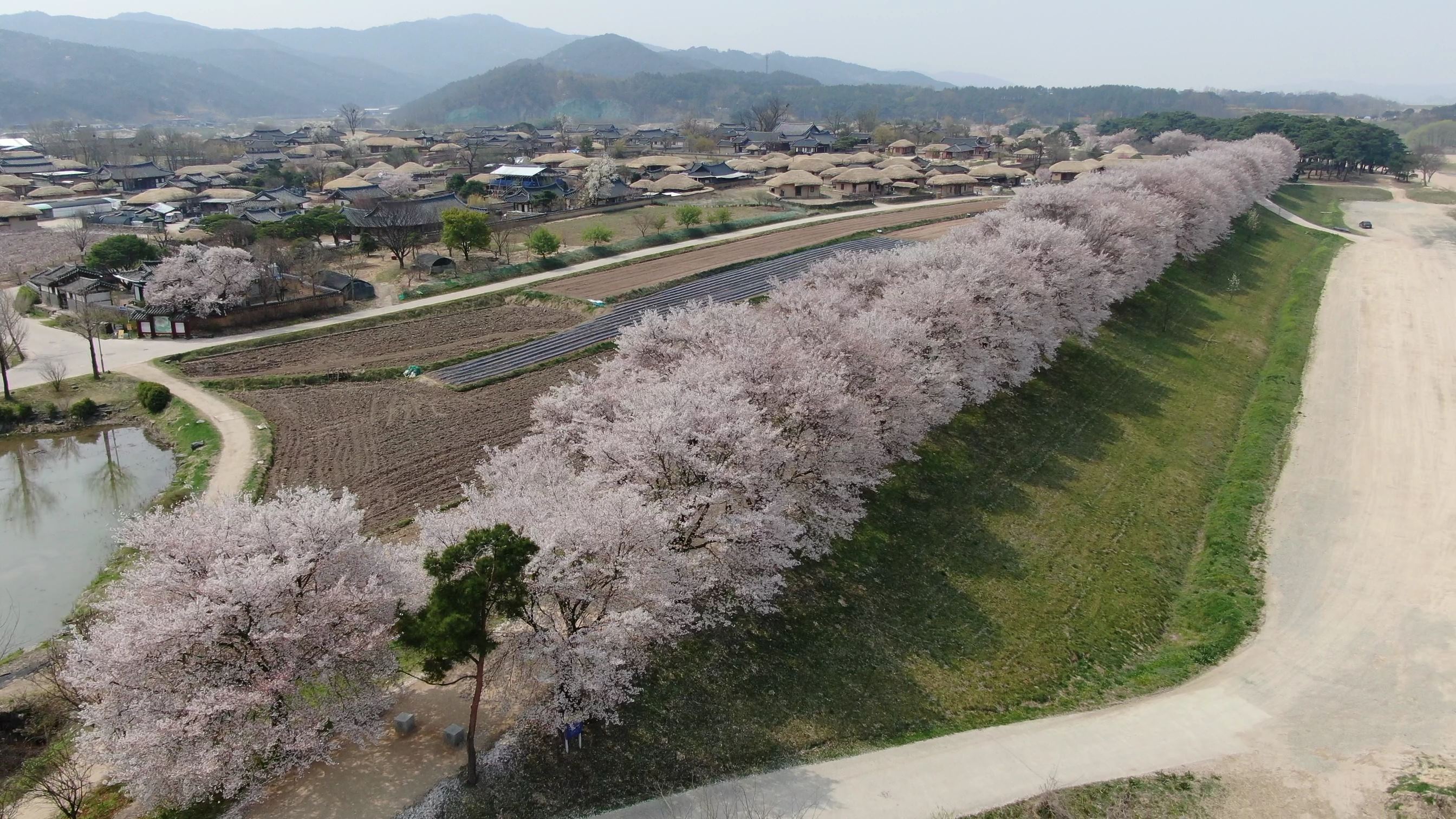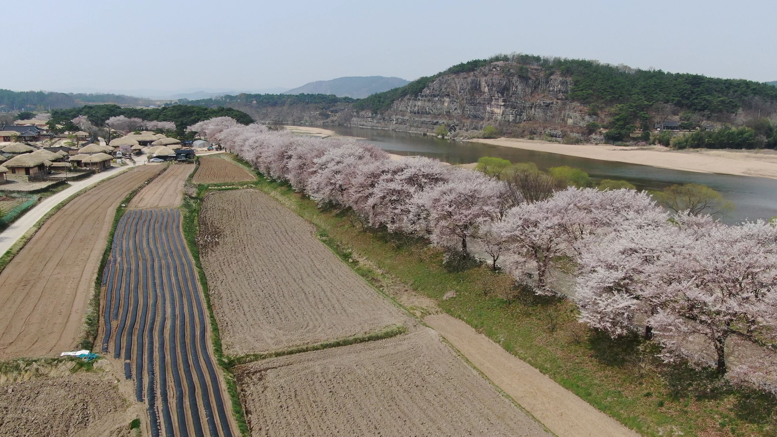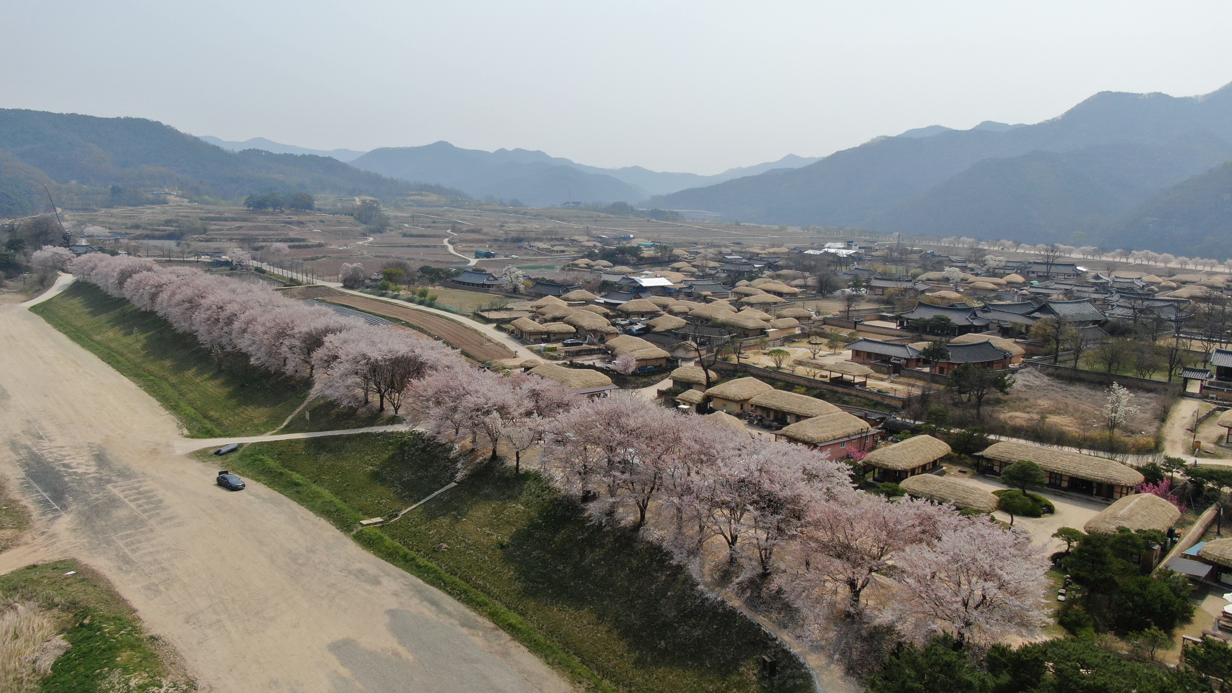 하늘에서 바라본 하회마을은 제방을 따라 만개한 벚꽂이 마을을 둘러싸고 있어 기와와 초가, 부용대 등 한국의 전통미와 어우러져 한 폭의 동양화를 연상케 한다.
