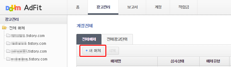 AdFit 메뉴에서 광고 관리를 선택한 다음 전체 매체의 새 매체를 선택한다. 운영하는 티스토리가 여러 개일 경우 각 주소마다 새 매체로 등록해주면 된다.