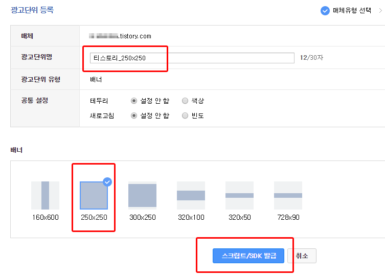 티스토리 상단 광고는 250x250와 728x90, 하단 광고는 728x90 , 사이드바 광고는 160x160 크기를 넣을 수 있으므로 동일한 순서로 광고 크기에 따라 필요한 개수만큼 만들어서 적용하면 된다.