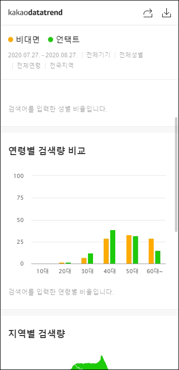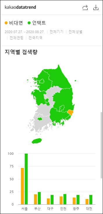 지역별로는 울산만 비대면 검색량이 높았고, 그외 지역은 언택트가 더 높거나 동일했다.