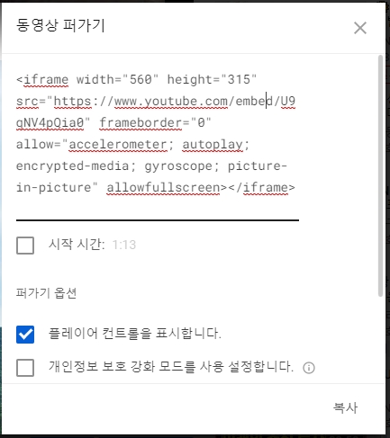 먼저 공유할 유튜브 영상에서 [공유] > [퍼가기] 버튼을 눌러 아이프레임 소스를 복사한다.