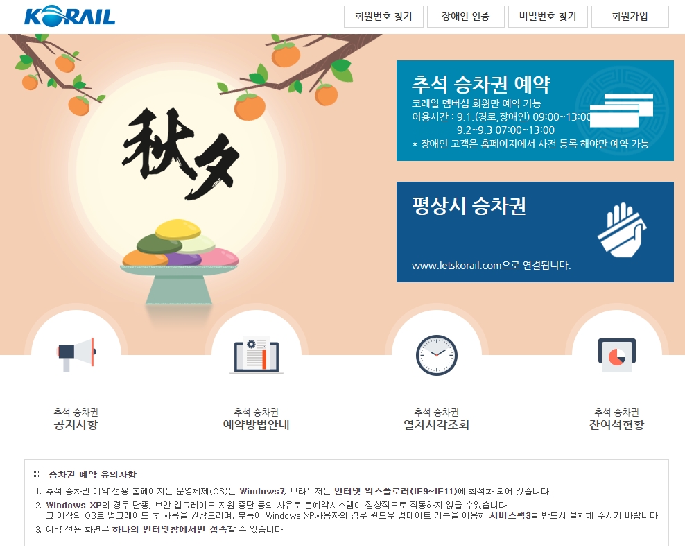 올해 추석 기차표는 코로나로 인한 사회적 거리두기로 현장 예매가 없다. 또한 입석표도 없다.