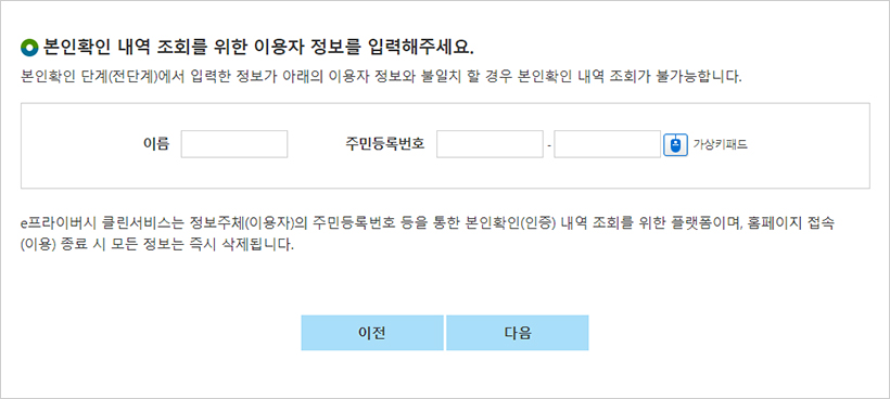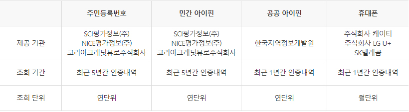단, 휴대폰에서 본인확인 내역을 조회할 경우에는 휴대폰 인증이 필수입니다.