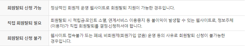 신청한 웹사이트 회원탈퇴는 처리완료 후 해당 계정정보가 복구가 되지 않으니 신중하게 검토하신 후에 신청해 주세요.
