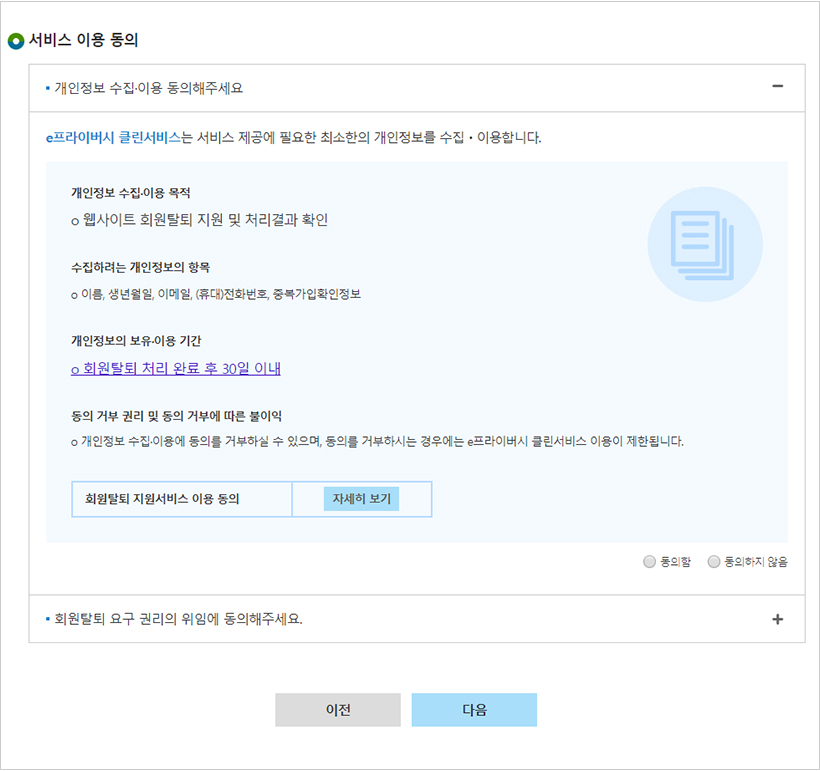 e프라이버시 클린서비스에서 제공하는 '웹사이트 회원탈퇴 처리지원' 서비스 이용을 위한 개인정보 수집 이용에 동의가 필요합니다.