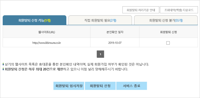 단, 회원탈퇴의 원활한 처리를 위해 신청건수는 하루 최대 20건으로 제한하고 있습니다.