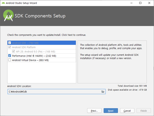 Andriod Virtural Device 는 체크를 해제하고 설치를 진행한다.