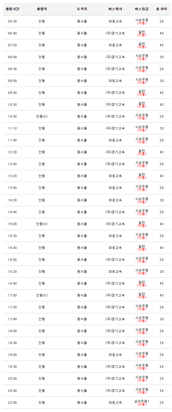 안동 -> 동서울 출발시간, 버스등급 상세 정보는 아래 표를 참고