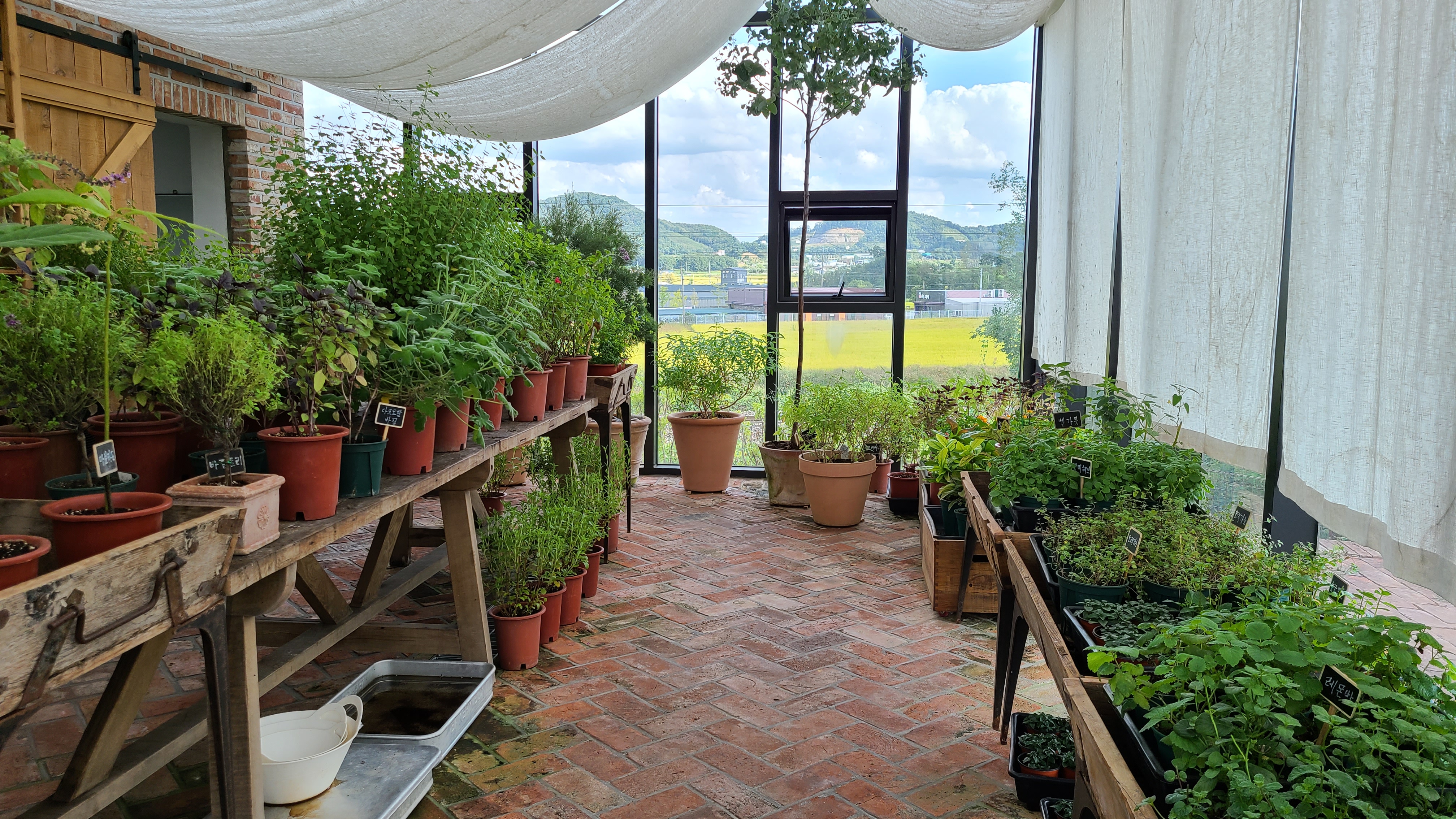 디저트류를 장식하는 식용 꽃과 허브를 키우는 유리 온실이다.