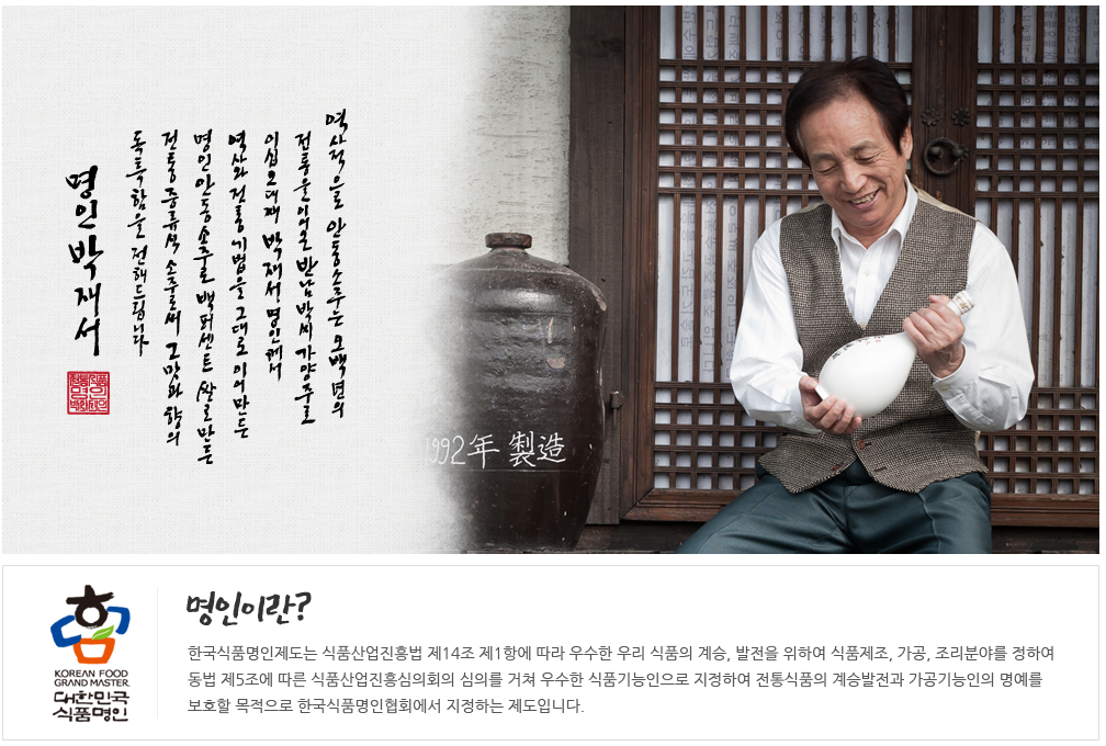 전통식품 명인 6호인 박재서 명인은 500년 넘게 가문에 이어져 내려온 안동소주의 비법 전수자로 불에 직접 닿지 않게 하는 중탕식 증류로 맛은 깨끗하고 부드러우며 향은 깊고 은은한 안동소주의 본연의 맛을 예술의 경지까지 끌어올린 장본인입니다.