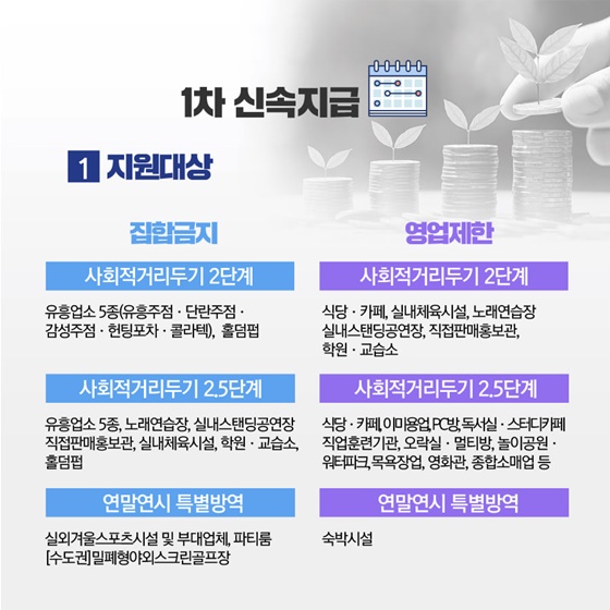 - 연말연시 특별방역 대상시설, 새희망자금 미수급자 중 "20년 1~1월 개업한 소상공인 등에서 지원대상을 추가 선별하여 1. 25일 이후 지급