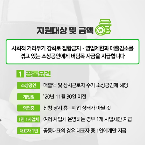 - 1인 1사업체 : 여러 사업체 운영하는 경우 1개 사업체만 지급