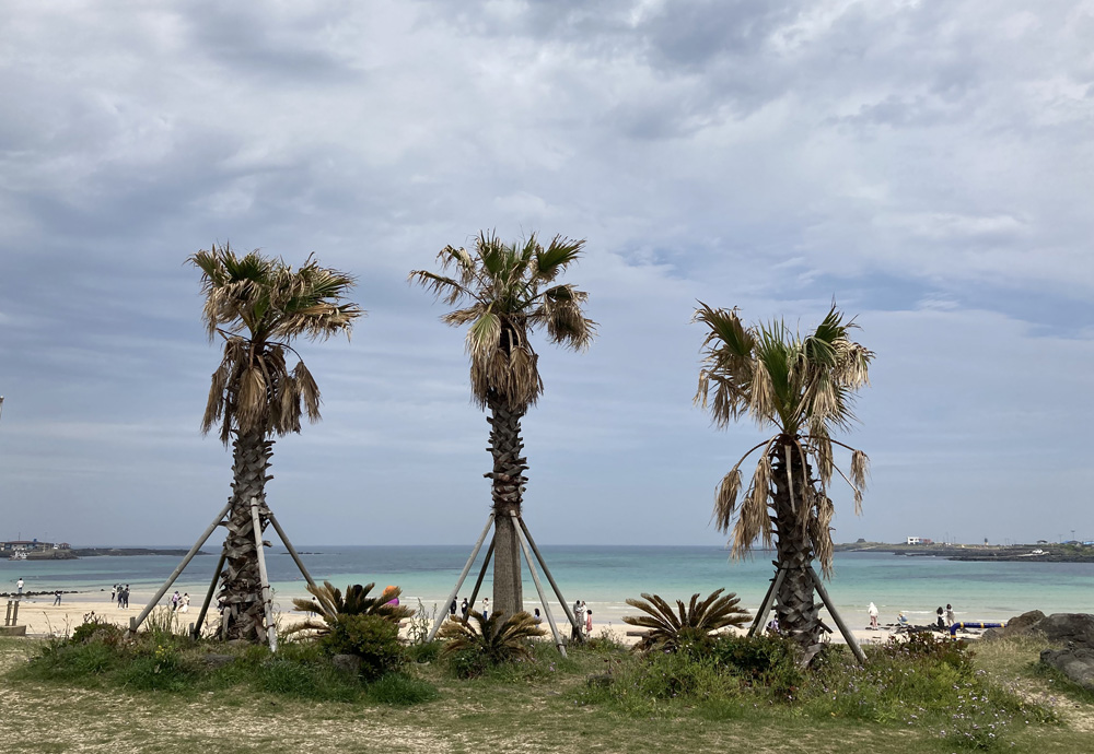 모래밭이 넓게 펼쳐져 있고 야자나무가 보여