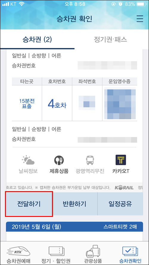보내고자 하는 승차권 이미지 아래에 전달하기 선택