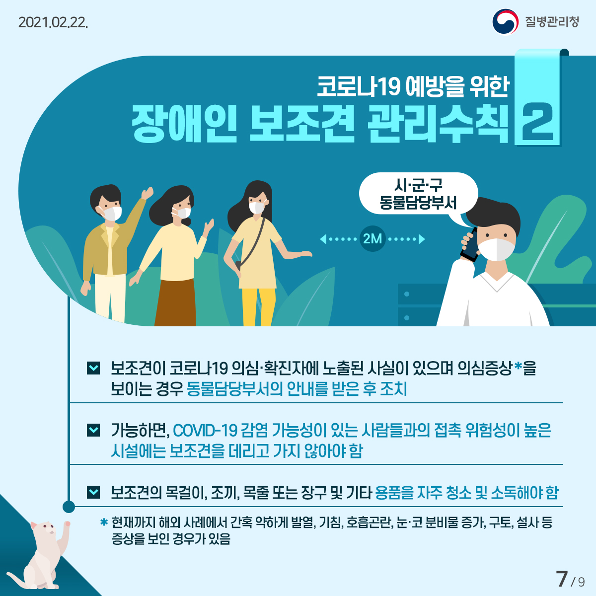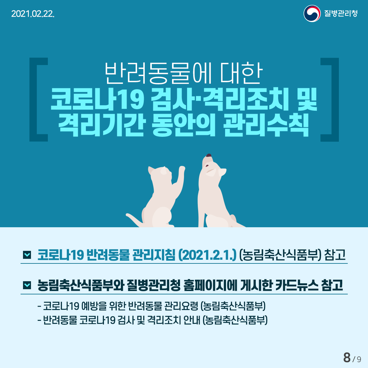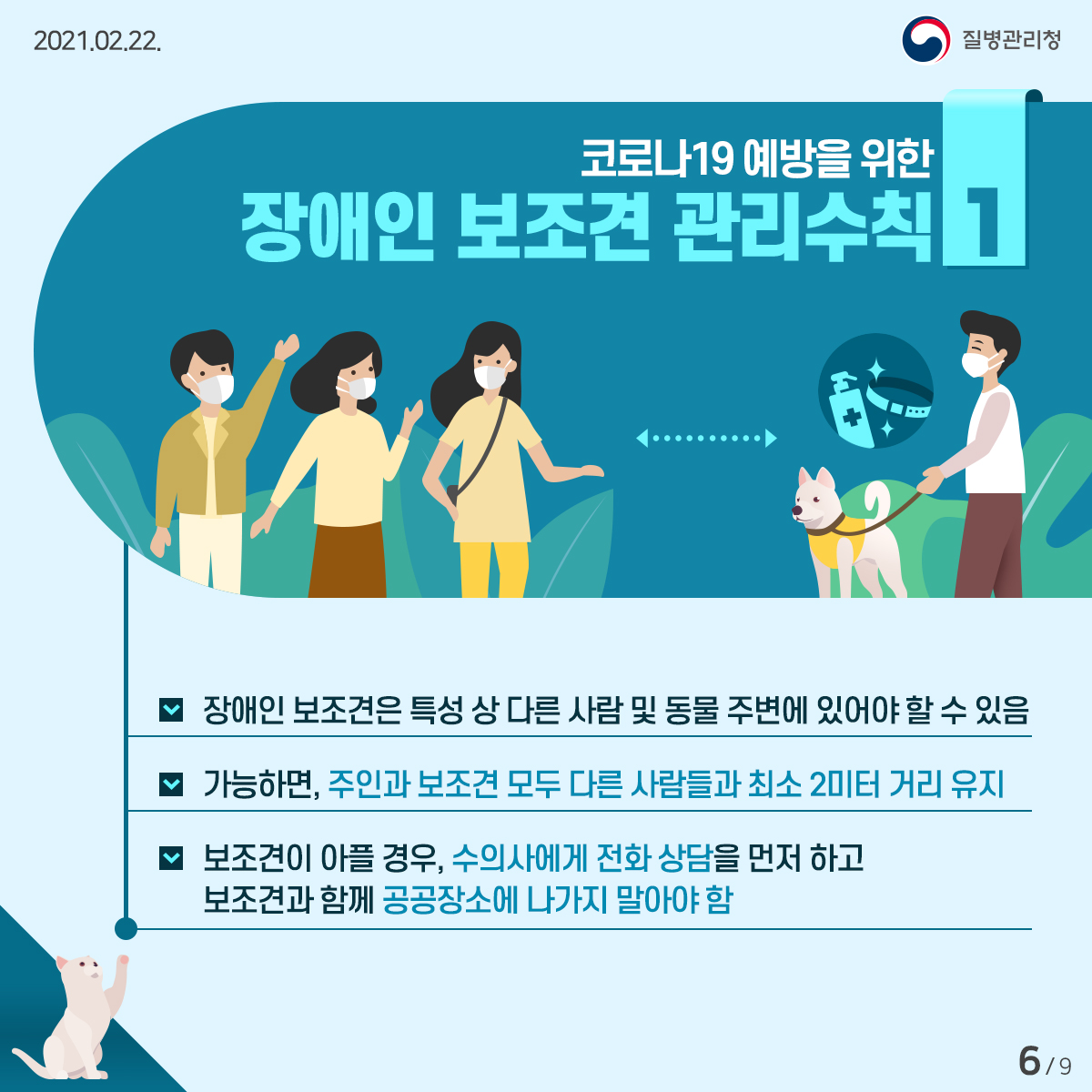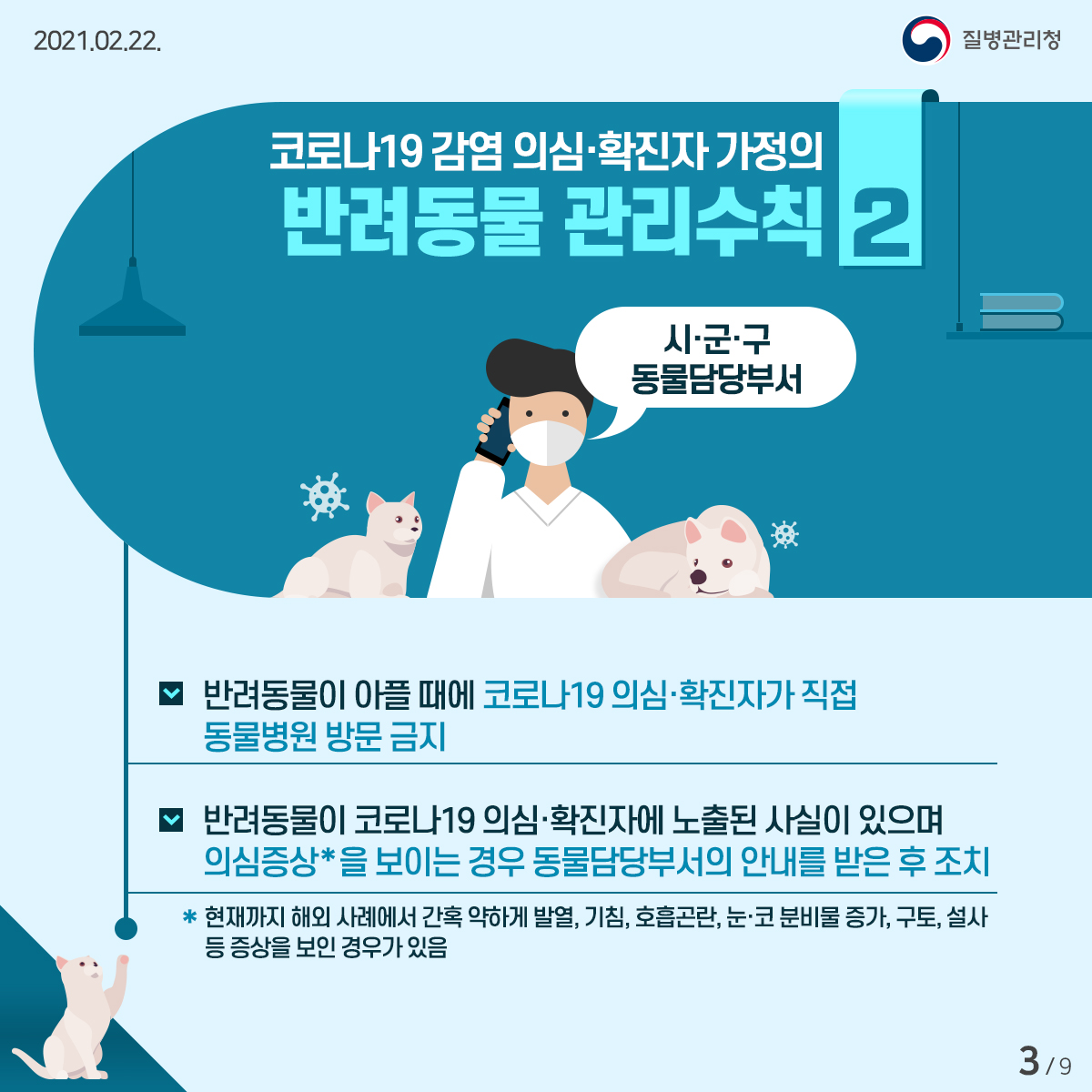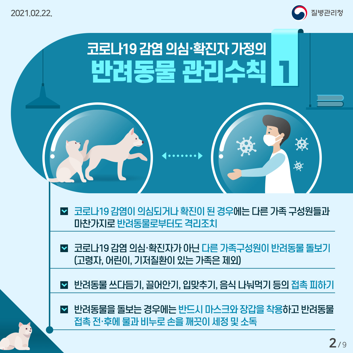 단독가구로 반려동물을 돌봐야 할땐 마스크와 장갑을 착용후 접촉 전후 세정 및 소독