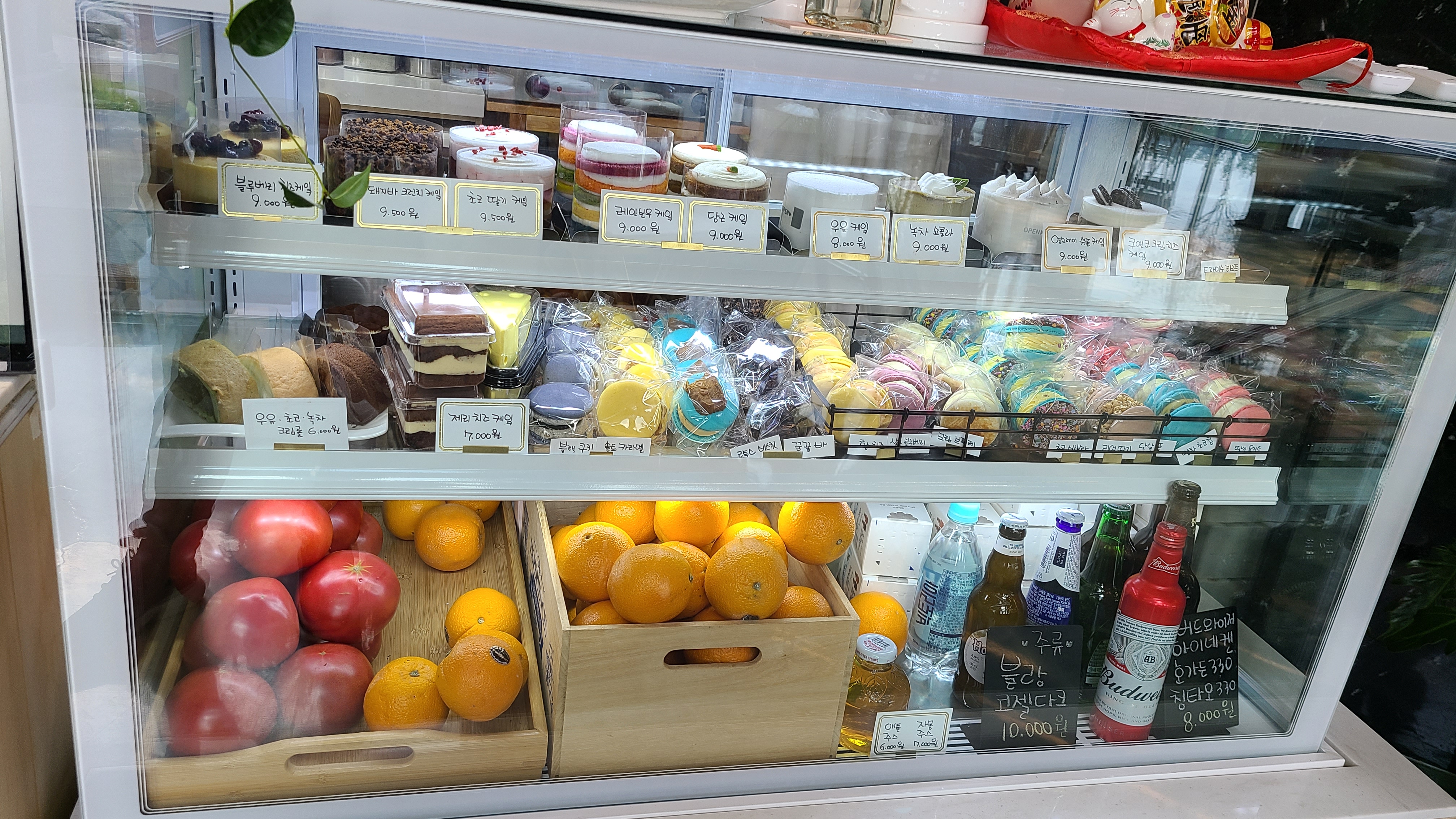 디저트 종류도 많아요 케이크, 마카롱 등등 (옆에 맥주도 있었네..?)