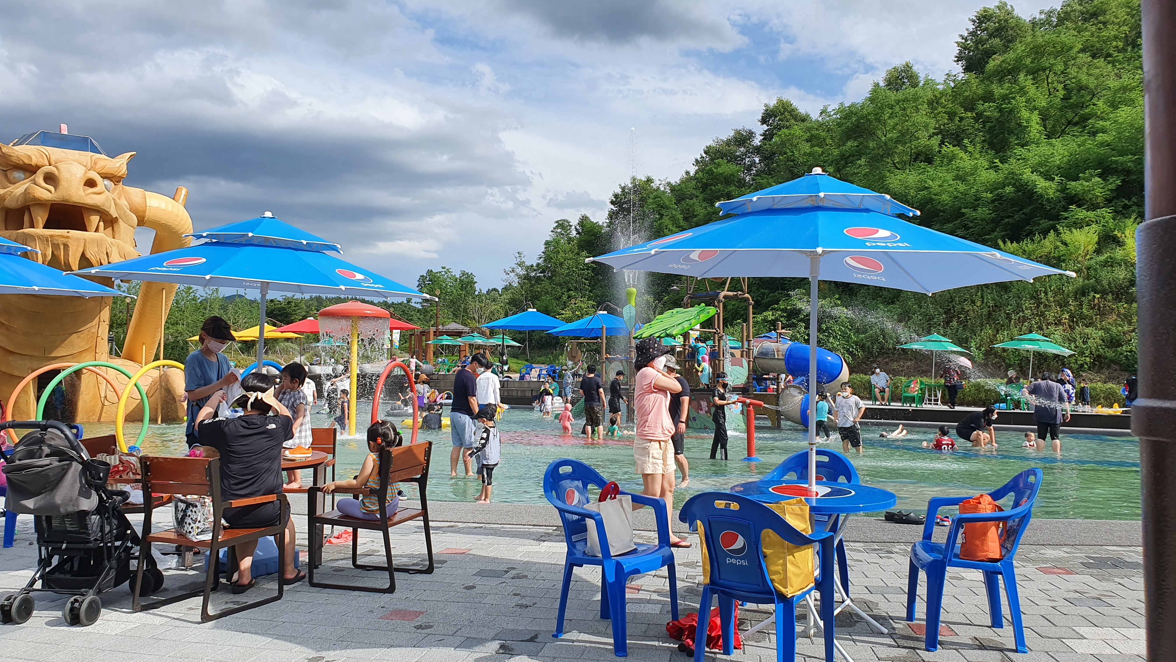 수영장 가쪽으로 설치된 파라솔테이블과 의자는