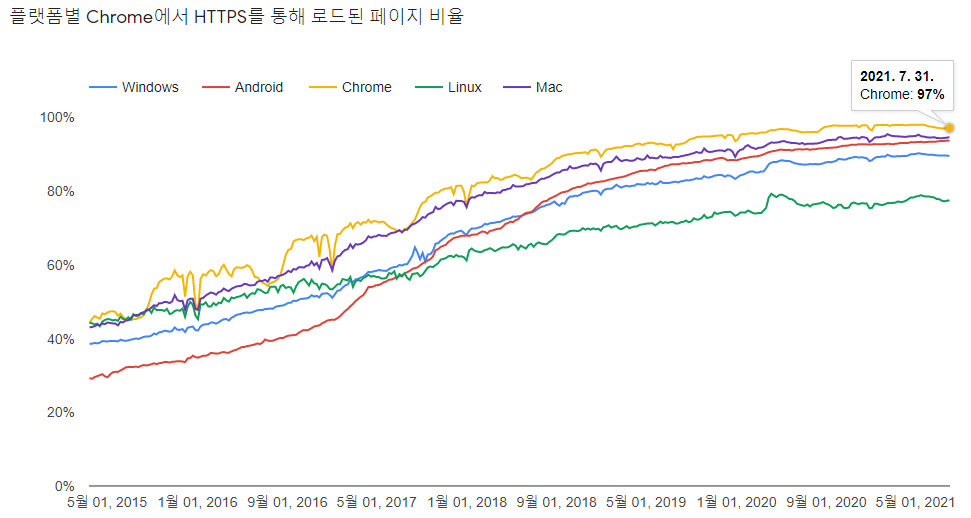 실제로 구글에서 암호화된 트래픽의 비율이