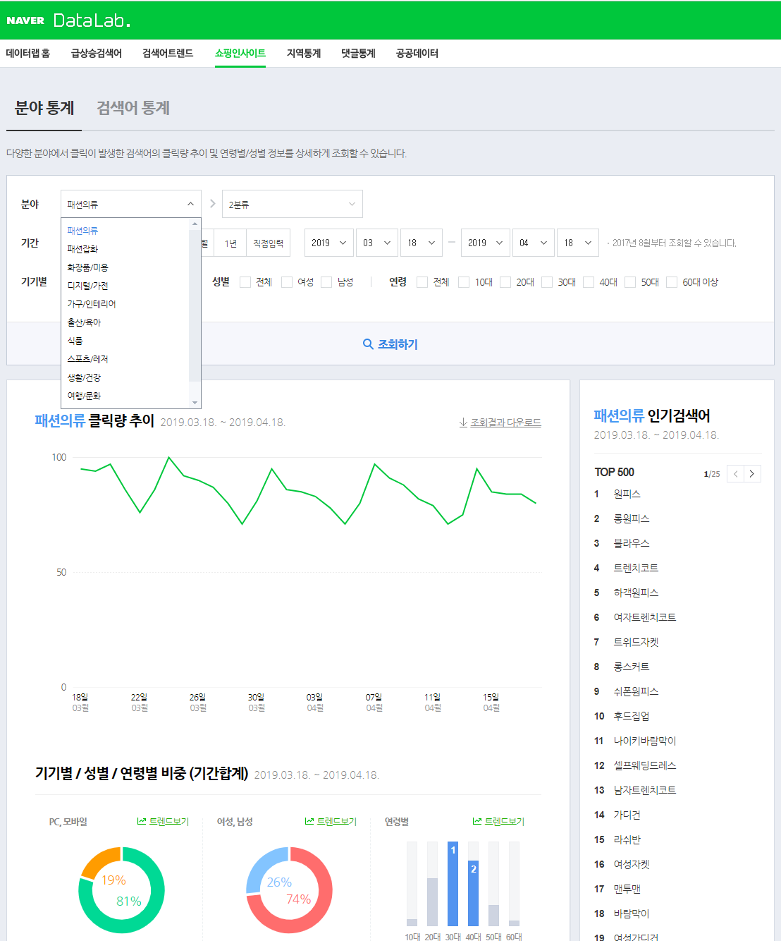 분야별 검색어의 클릭량 및 연령, 성별 분석이 가능하다.
