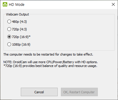 DroidCam Client와 HD mode 가 있는데 DroidCam Client를 실행한다.
